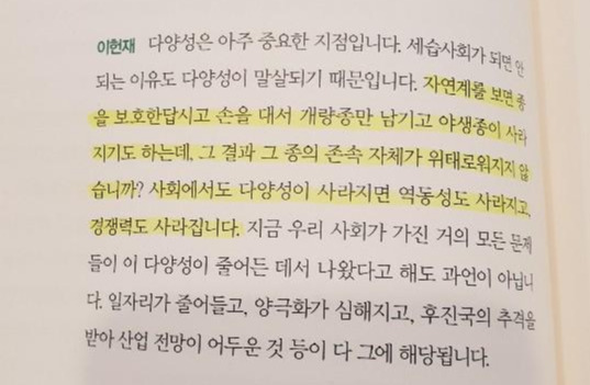 이원재 : 국가가 먼저 구체적 해법을 내놓고 사회의 자원을 동원해 끌고 가는 방식은 이미 낡았습니다.(…) 국가 운영 방식은 과거와 달라야 합니다.(…) 국민에게 필요한 변화를 의견을 모아 정리하고, 여러 가지 다른 생각을 연결하며 조정해 결론을 이끌어낼 수 있는 리더십이라야 합니다. 정부는 플랫폼 역할을 해야 하고, 리더는 퍼실리테이터 역할을 하는 방식이어야 사회 통합을 이루면서 성공적인 변화를 이끌 수 있으리라 생각합니다. - 150~151p