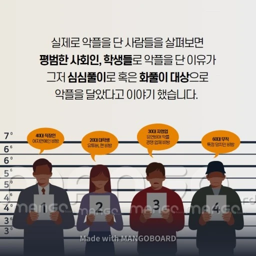 하지만 그들과 가까워지고 많은 대화를 나누다 보면 깊은 내면에는 각자의 아픔이 존재했고, 대부분의 아픔은 '악플'로부터 시작되었다는 걸 알 수 있었습니다. (심한 경우 신상 털이, 스토킹 등으로 이어집니다)