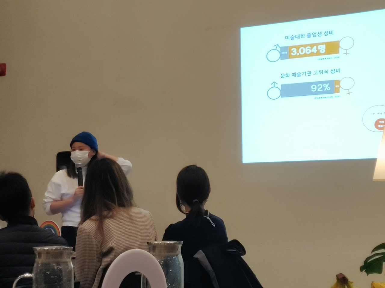C: 배달 어플, 가사노동 플랫폼 등에서는 플랫폼 노동자로서의 목소리를 단체로 많이 내고 있습니다. 정치적인 부분에서도 국회의원과 소통하면서 정책을 바꿀 수 있는 것들에 대해 협상을 하고 있습니다. 왜 이 아젠다를 문화예술이나 컨텐츠 창작자들이 가져오지 못할까요. 개인 간의 연대에서 더 나아가서, 협동조합이나 노동조합을 조직하지 못하는 탓도 있지 않을까요. 프리랜서 업에 대한 문제, 이 안에서 여성 노동 시장에서의 성차별에 대한 문제를 제기하기 위해서는 당사자가 나서서 조직화하는 작업이 필요하지 않나, 하는 생각을 합니다.
