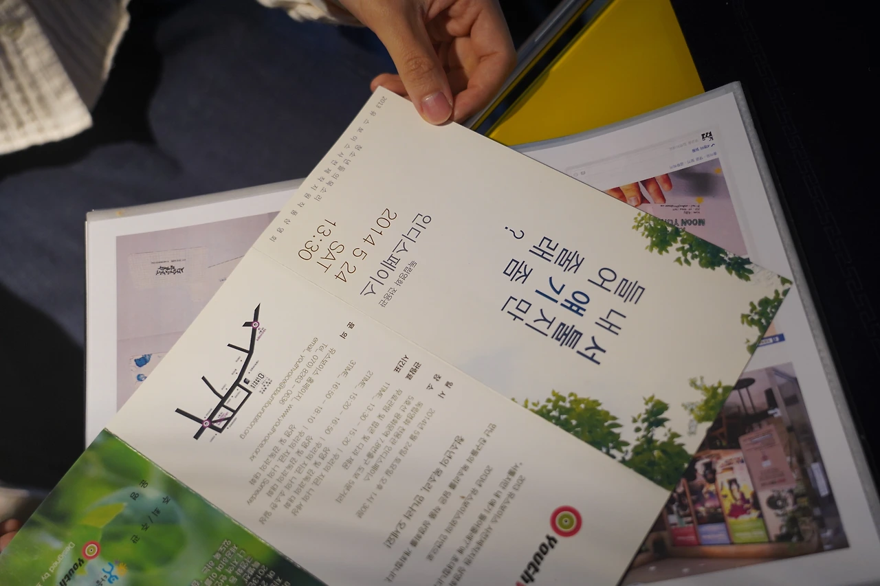 '서툴지만, 내 이야기 좀 들어줄래?'라는 카피가 홍보 컨텐츠의 메인이었는데요. 프렌토에서 다같이 고민하며 카피를 뽑고 투표했었어서 아직도 애정하는 카피예요. 그때 제가 팜플렛 디자인을 맡았는데, 같이 작업하던 친구랑 팜플렛에 넣을 숲 사진을 찍으러 서울숲에 가기도 했어요. 디자인을 배우던 학생이어서, 행사 리플릿이나 포스터를 만들어 보는 경험이 참 소중했었어요. 그때는 처음으로 내 디자인이 몇 백부씩 인쇄되던 순간이었기 때문에 오탈자는 없는지 계속 뚫어져라 쳐다봤던 기억이 나요. 엉성했지만 정말 열심히 만든 거였거든요.(웃음)