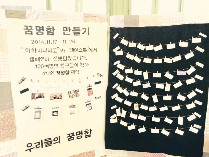 그리고 제가 민들레 캠페인 했던 걸 서울역 284 에서 전시도 했었는데요. 컨퍼런스 때 꿈명함을 만들 수 있는 참여 부스와 지금껏 모은 친구들의 꿈명함을 전시하는 판넬 같은 게 필요했어요. 근데 몇일 간만 전시하고 철수 할 거라 아깝더라고요. 그래서 아예 판넬을 리사이클 재료로 만들고 싶다는 생각이 막연하게 있었어요. 지금 생각해보면 저렇게 큰 책을 어떻게 박스와 재활용 천으로 만들었지? 싶은데. (웃음)