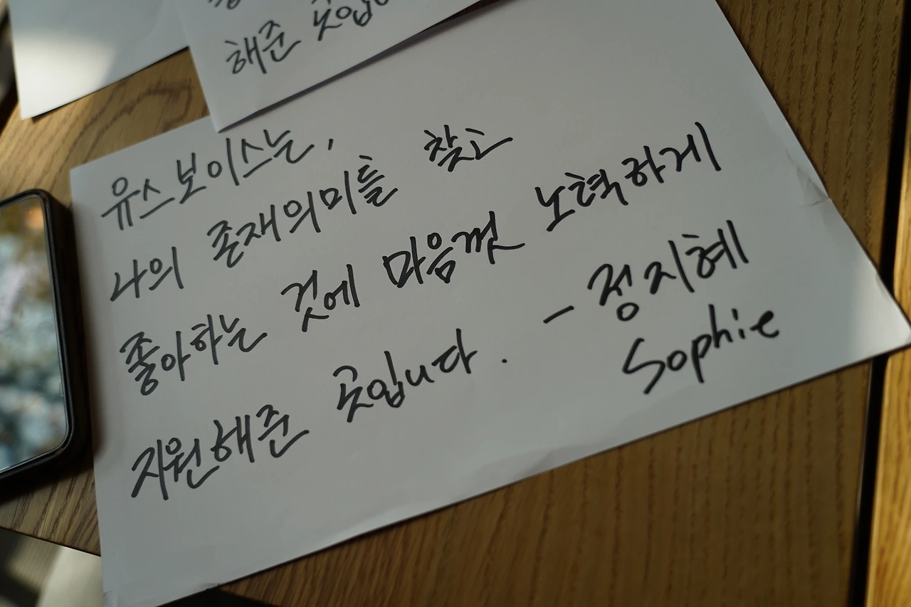 첫째로는 알았으면 좋겠어요. 나를 알고, 내가 하는 일과 내 행복이 무엇인지 알았으면 좋겠어요. 행복을 느끼면 그게 행복이란 걸 알았으면 좋겠고, 내가 누군지 알았으면 좋겠고, 내가 하는 일이 무엇인지 알았으면 좋겠어요. 유스보이스에게 전한다며 유스보이스가 누구고, 유스보이스가 하는 일이 무엇이고, 유스보이스가 어땠을 때 가장 행복한지 알았으면 좋겠어요.