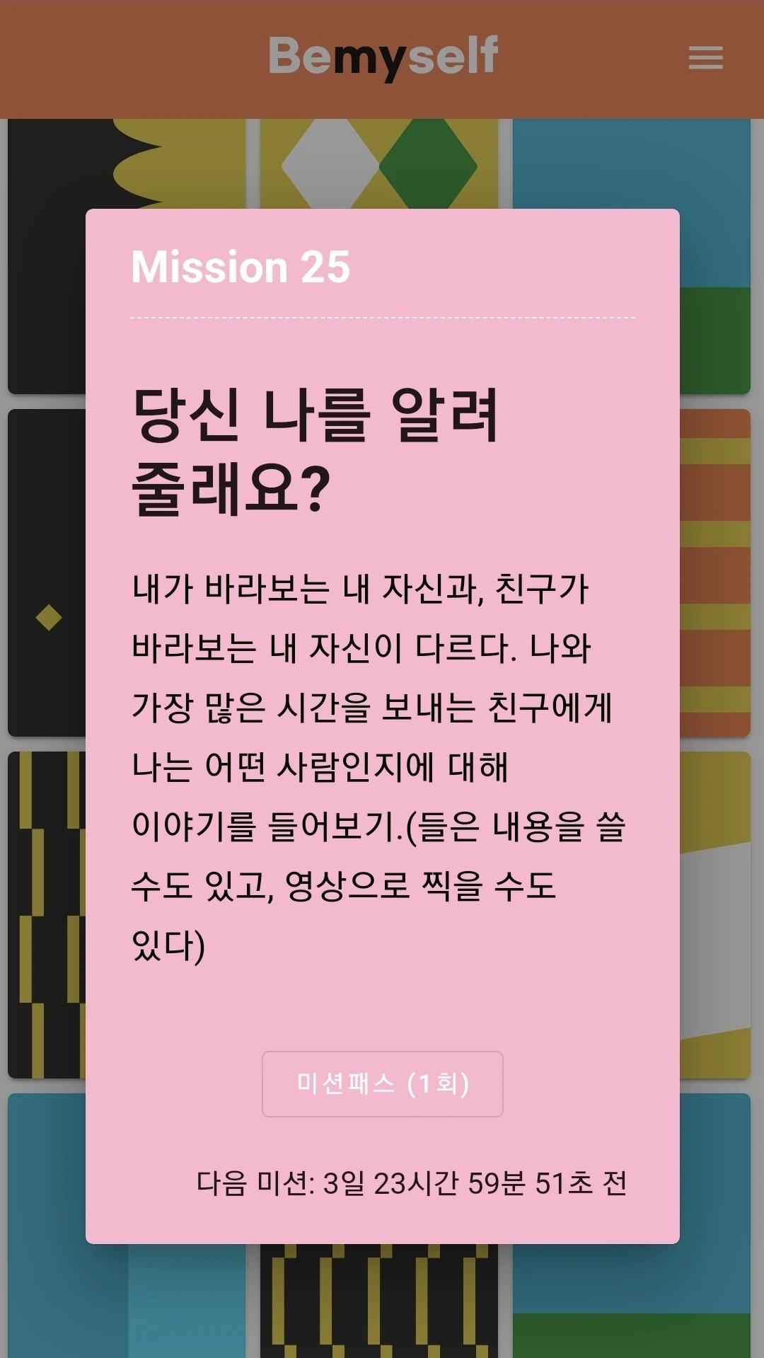 마지막 미션은 내가 바라보는 나와 친구가 바라보는 나에 관한 것이었는데요. 친구들의 솔직한 이야기를 들어보면서 저도 나에 대해 더 알아갈 수 있는 시간이 되었던 것 같아요.