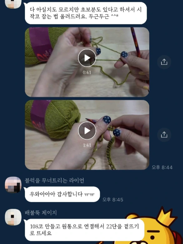 제가 다 알려주는 것이 아니고, 앉아서 계속 뜨다가 잘 모르시는 분들을 옆에서 알려 드리는 식으로 진행해요. 실력 차가 있다 보니 아까 말씀드린 실력자 분이나 조금 더 잘 아시는 분이 옆에 앉아서 서브 선생님처럼 알려드리기도 하고요. 그리고 모여서 뜨면 좀 더 속도가 나오는 것 같아요. 모여서 막 뜨고, 삘이 받은 상태로 집에서 더 떠서 온라인으로 자랑하기도 하고, 모르는 거 서로 물어보기도 하는 식으로 하고 있어요. 지난주에 모였을 때 모임원의 절반 정도는 하나를 완성했고, 완성하신 분들은 새로운 걸 뜨기 시작했어요.
