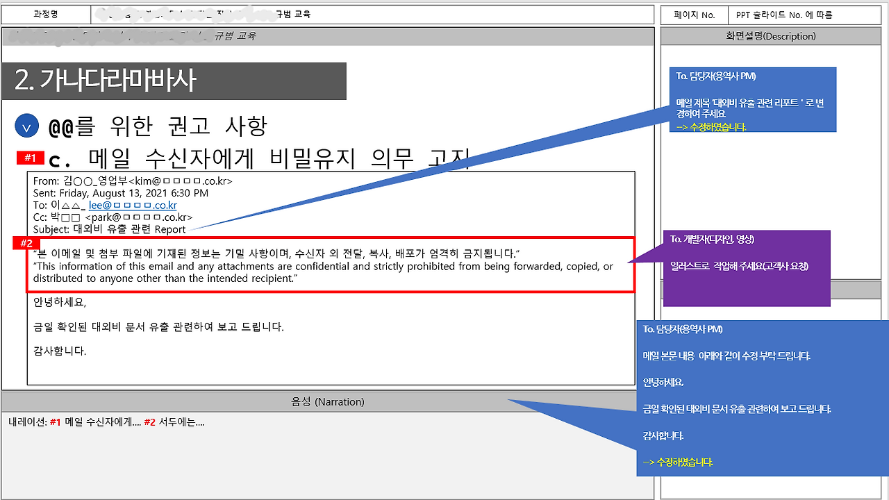 그때 필요한 가이드라인이 바로 '스토리보드'이다. 앞서 설명한 '스크립트'는 주제가 무엇인지, 그것을 설명하는 다양한 예시와 근거 혹은 경험 등을 다듬어 메시지 알맹이의 구조를 만드는 작업인 반면, '스토리보드'는 그 알맹이를 화면 안에서 어.떻.게 전달할 것인가가 핵심이다. 편집을 위한 보드의 경우, 시간 순서에 맞춰(자막에 맞춰) 효과를 주고자 하는 부분을 표시하거나, 설명하는 방식으로 정리한다.