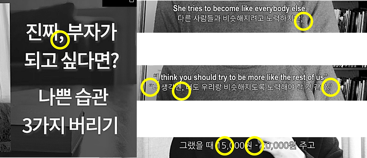 처음에 말자막 작업을 할 때는 별생각 없이 내가 그동안 출판사에서 배웠던 기준으로 진행했다. 모두가 다 아는 맞춤법, 띄어쓰기를 적용했고 마침표, 큰/작은따옴표, 반점(쉼표), 소/중/대괄호, 겹/홑 낫표, 겹/홑 화살 괄호, 물결표, 말줄임표, 빗금 등 최대한 한글 맞춤법 규정에 어긋나지 않도록 최선을 다했다.