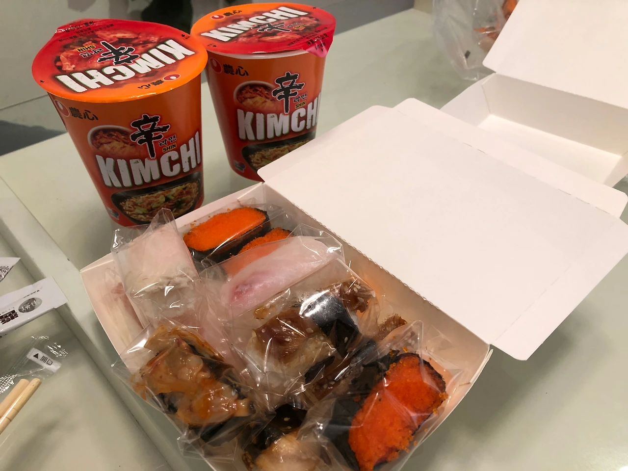 저녁은 초밥을 사와서 컵라면과 먹었다.