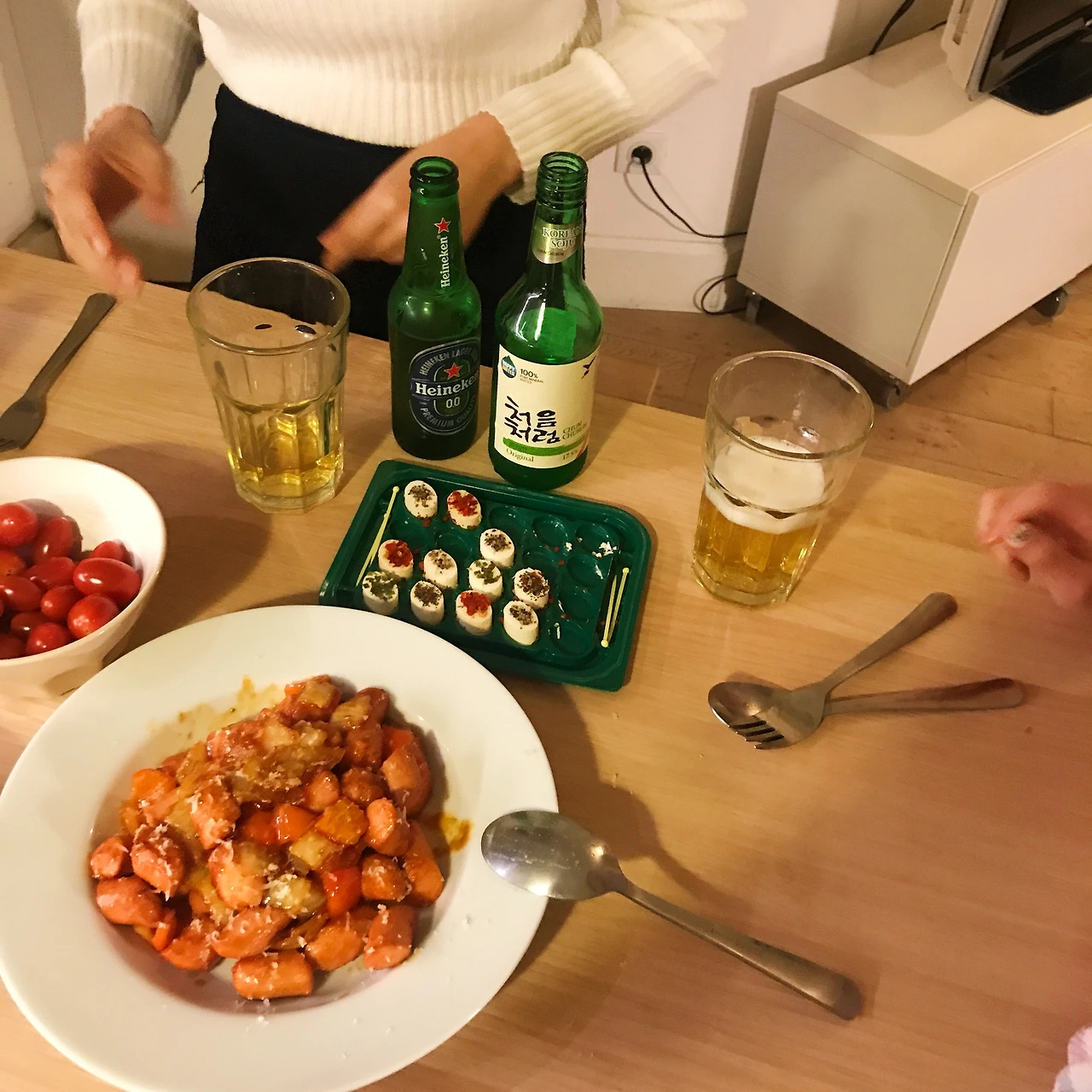 혹시나 하고 비행기에서 챙겨 둔 고추장을 이렇게 쓰게 될 줄은 몰랐다. 고추장 두 개를 풀고 설탕을 탔다. 올리고당이 있으면 좋겠지만 그런 건 없는 파리에선 꿀을 조금 얹었다. 슈퍼에서 사 오는 것을 잊은 마늘을 대신해 마늘 가루를 톡톡 쳐 넣었고 케첩을 사랑하는 J를 위해 케첩을 크게 퍼서 함께 섞었다. 이런 엉망진창인 양념이 파리만의 마법으로 빛나기를 속으로 빌면서. 다행히 한인 슈퍼에서 사 온 냉동만두가 있어 마음이 놓였다. 부족한 안주는 이것으로 채울 수 있다.