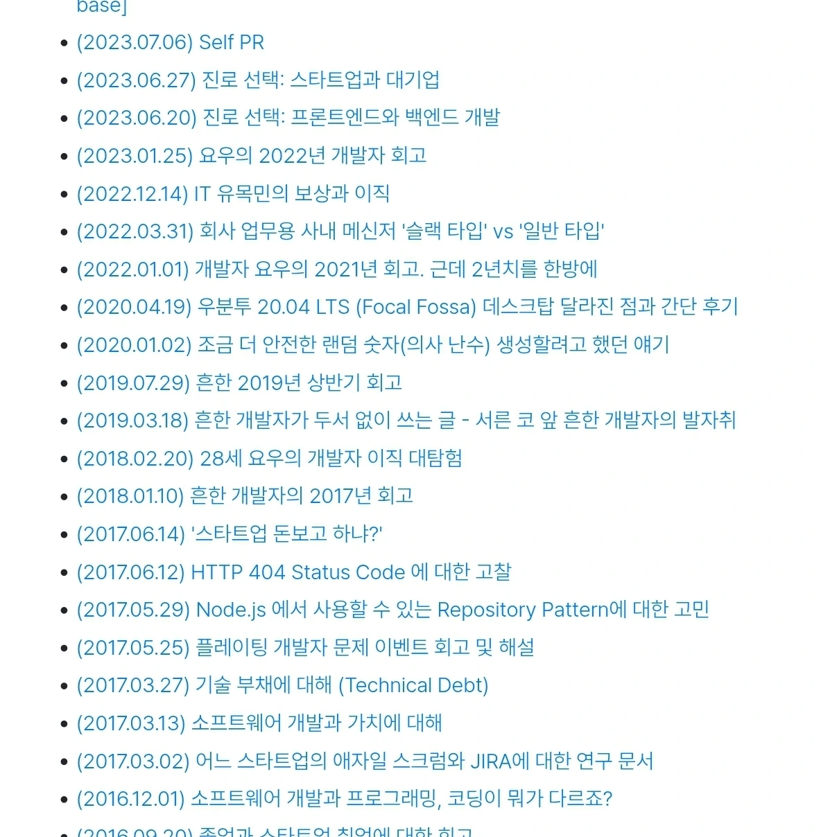 잡설이 길었다. 위를 다시 읽어보니, 옛날엔 무지성 똥글만 질러댔던 것처럼 보이지만, 그래도 가끔 오래된 내 글에 도움을 받았다는 감사 메일을 받거나, 면접이나 옮기게 된 회사에서 내 SNS, 블로그 글을 보신 분이 알아봐주고 좋게 봐주시는 경우도 있어 감사할 따름이다. (놀랍게도 지금 회사의 사내 밴드 동아리에도 그런 분이 있다. 물론 나는 수치사 직전까지 갔다 옴)
