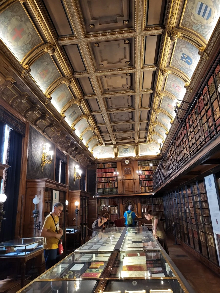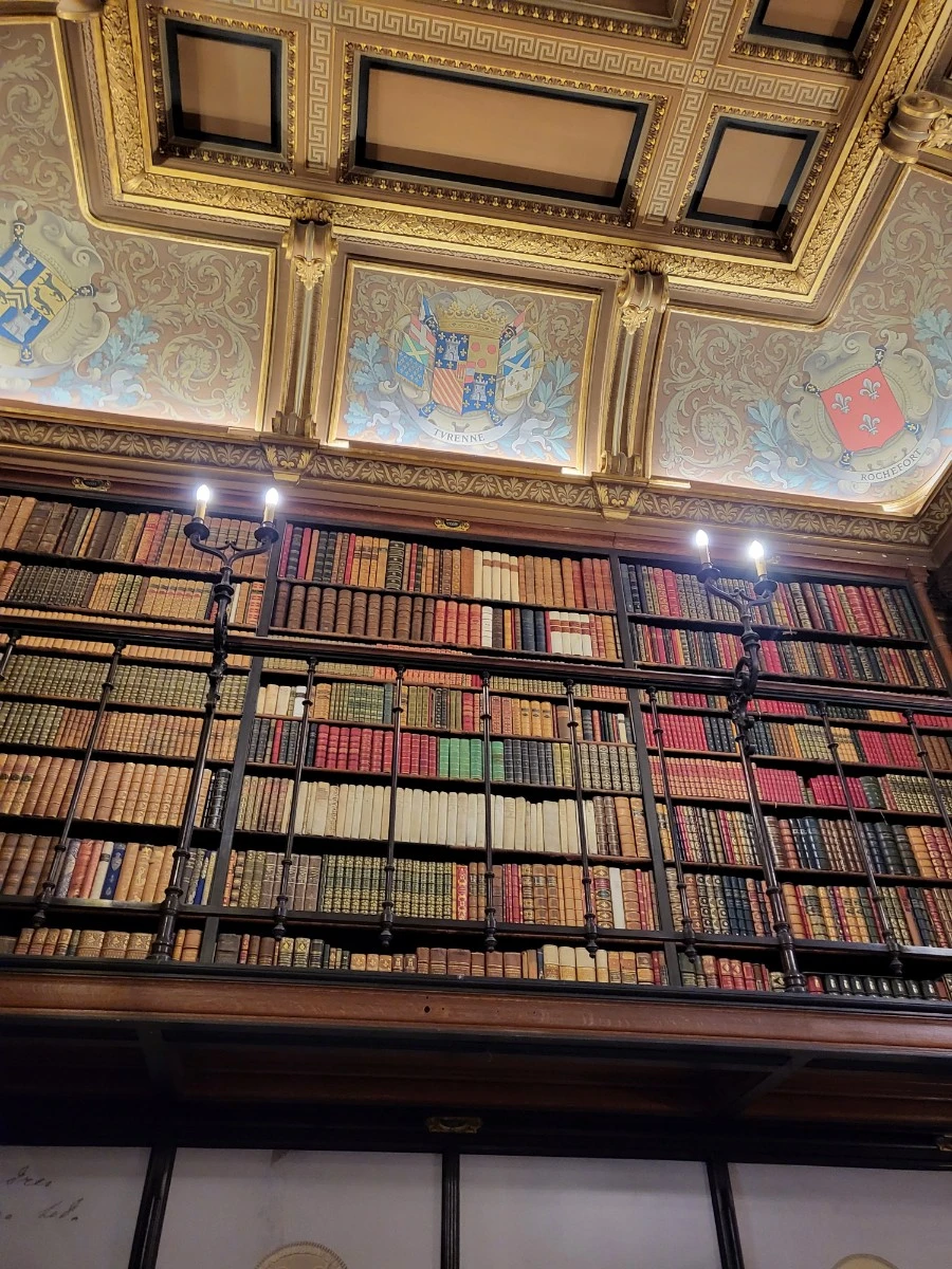 오말 공작이 수년동안 모은 서적과 고문서들을 보며 작은 서재에서 박물관 못지않은 아우라를 느낄 수 있었다. 샹티이성에는 총 60,000권의 서적과 문서들이 있고 그중에 19,000권이 이 서재에 보관되어 있다. 이는 다양한 분야를 다루는 1500권의 원고와 17,500권의 책으로 구성되어 있는데, 프랑스 국립도서관에 이어 두 번째 규모를 자랑한다.
