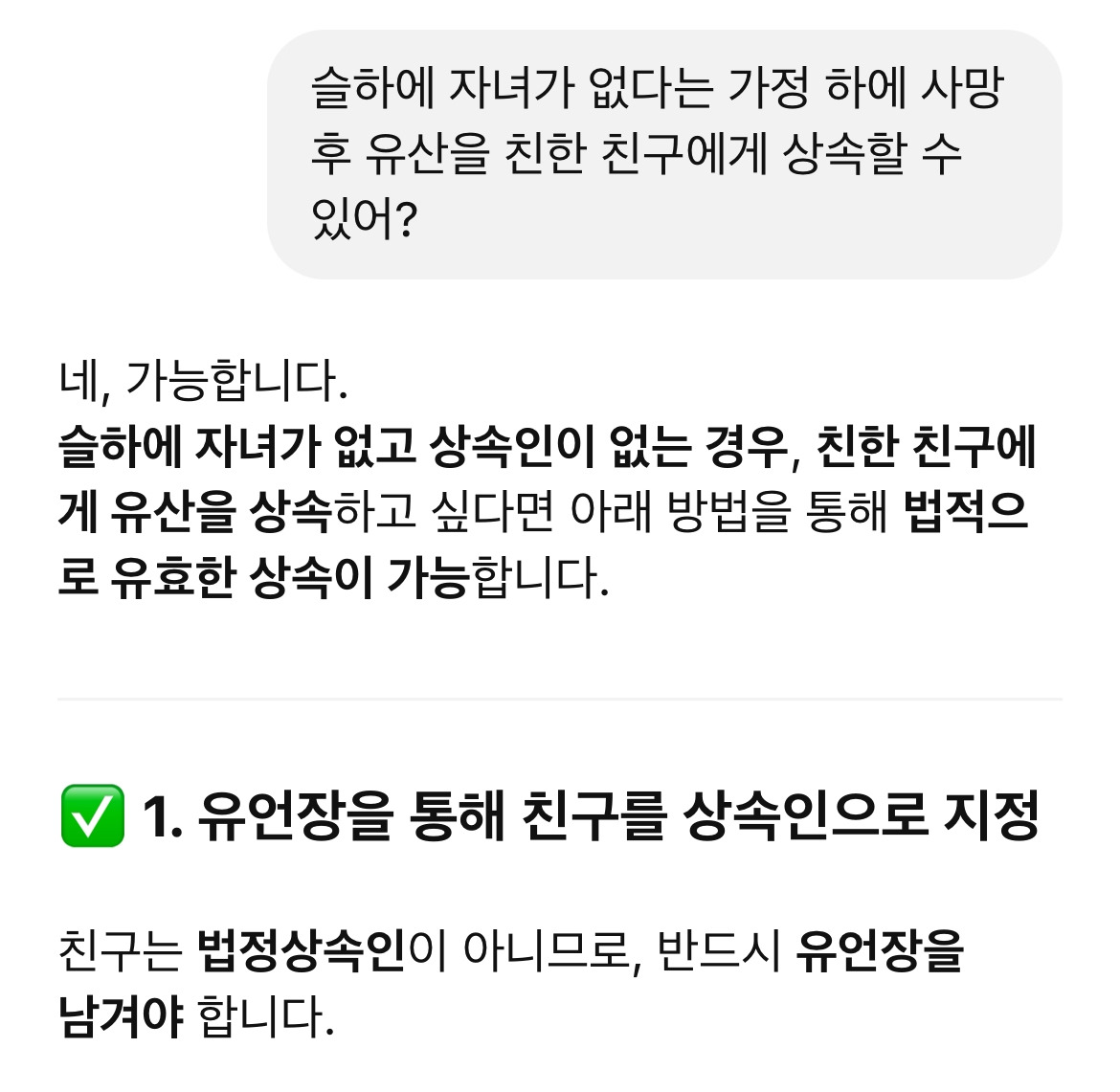 슬하에 자식도, 친밀한 가족도 없다면 친한 친구에게 유산 상속을 하는 게 가능한가? 상속법에 관해서는 문 외한이나 마찬가지이니, 일단은 챗지피티에게 도움을 구해봅니다.