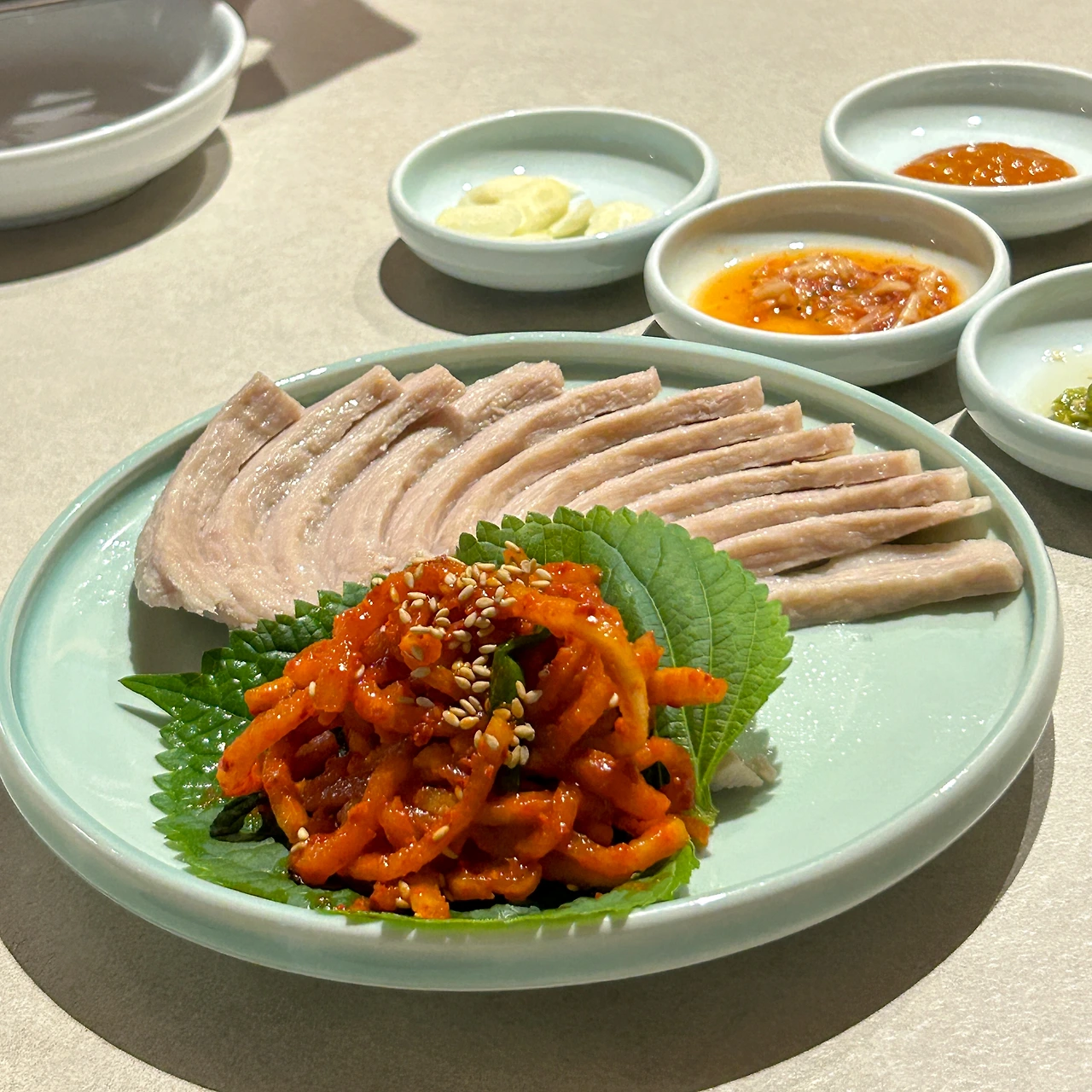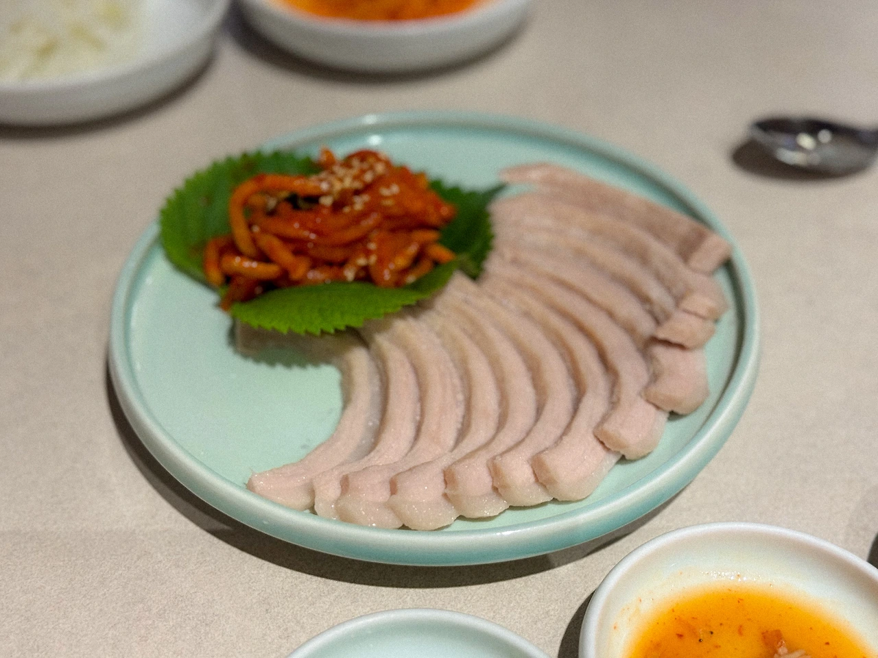 정갈하게 고명을 쌓아올린 냉면에서 느꼈듯 서령은 투박한 맛이 있는 노포들과 달리 비주얼에도 신경을 많이 기울이는 곳이라는 생각을 했는데요. 수육의 플레이팅도 예사롭지 않았습니다. 그동안 매번 두꺼운 삼겹수육만 먹어봤기 때문일까요..? 맵시 좋게 썰어놓은 항정수육을 밖에서 먹어본 게 처음이라 유독 시각적인 임팩트가 강했습니다.