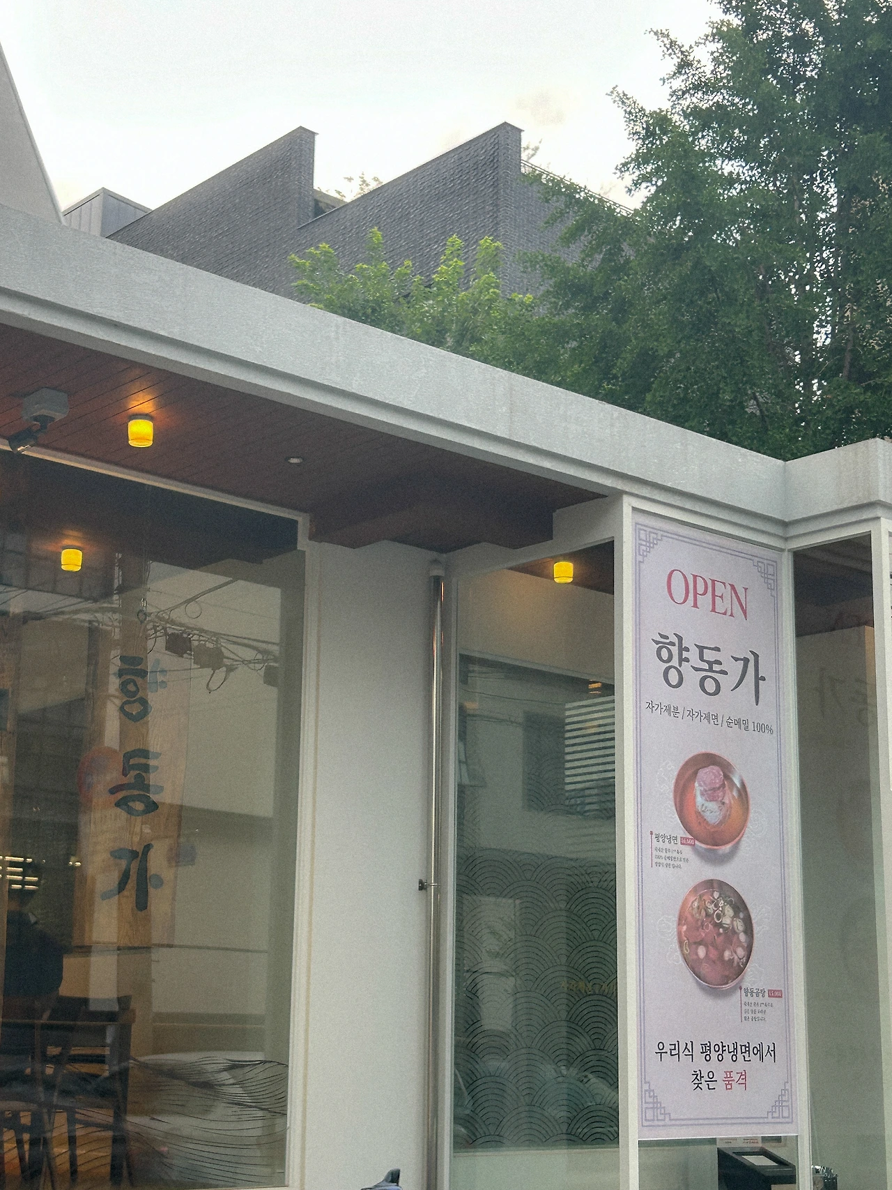 한여름의 평양냉면은 길고 긴 웨이팅이 예상되기 마련이지만, 이날 향동가의 앞은 꽤 여유로웠습니다. 최근 올라왔던 안성재 셰프의 유튜브 콘텐츠가 방문 난이도를 극악으로 만들었을 줄 알았지만, 생각보다 그 여파가 세지 않아 다행이었습니다.