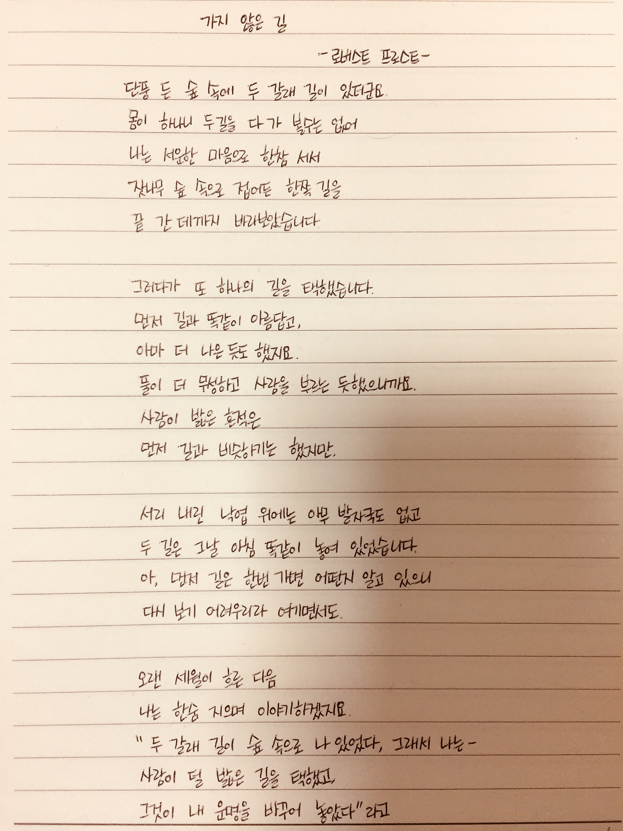두 갈래 길이 숲 속으로 나 있었다, 그래서 나는 -