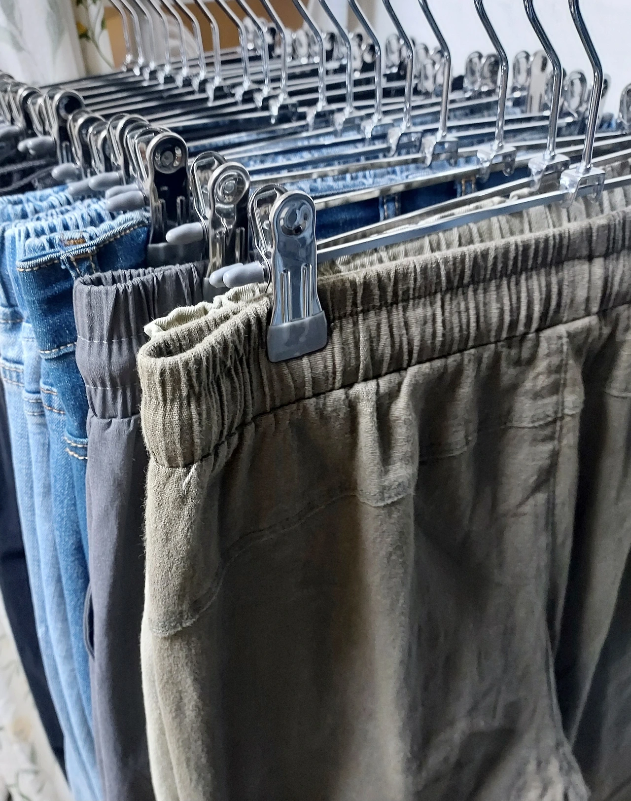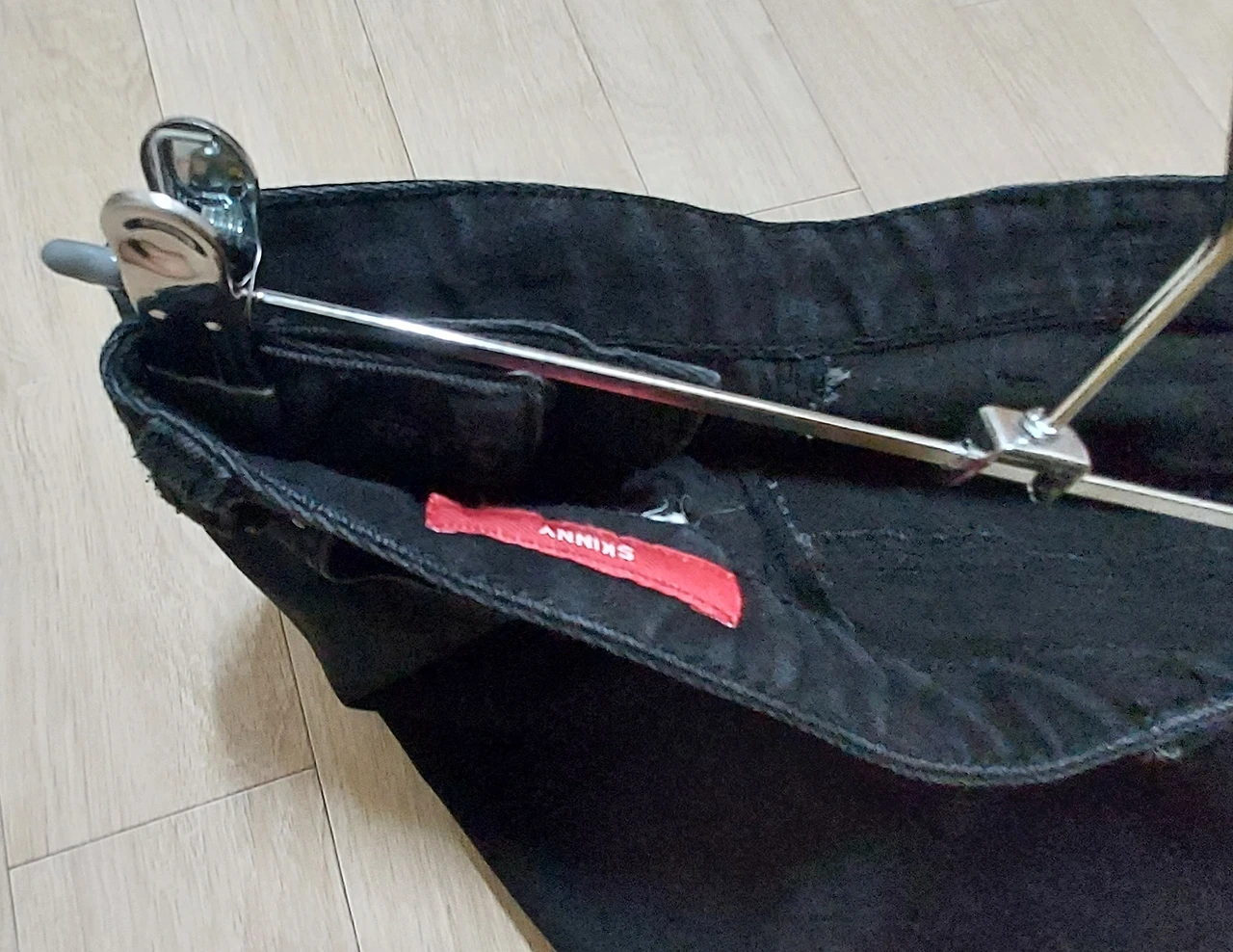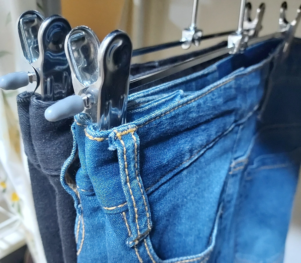 허리사이즈가 같아도 옷 스타일에 따라 허리 폭의 길이가 조금씩 차이가 있을 것이다. 이럴 때 검지 두 마디 정도에 기준을 맞춰 옷걸이 집게를 집어 걸면 전체적인 모양새가 매끄러운 효과를 볼 수 있다.