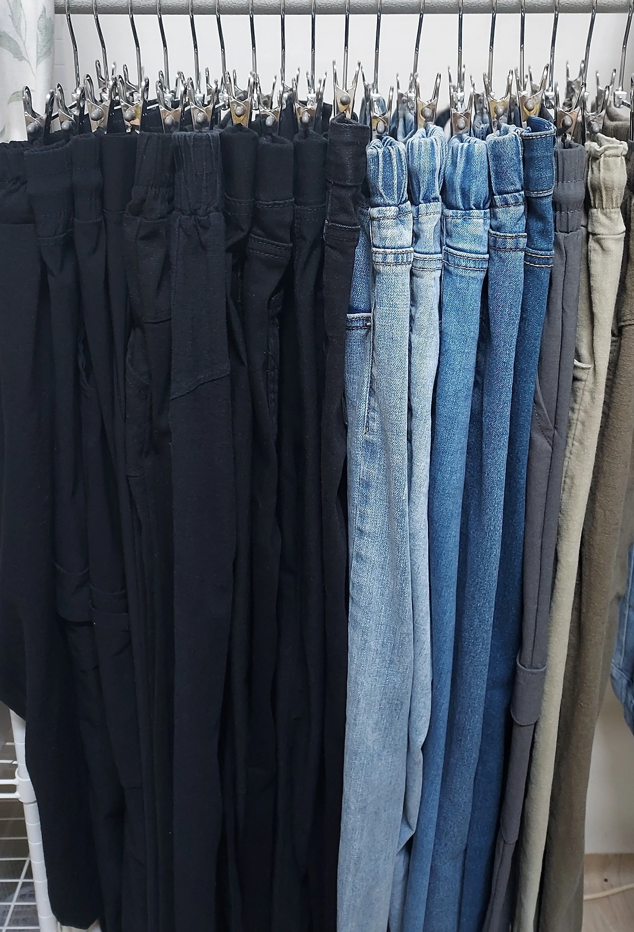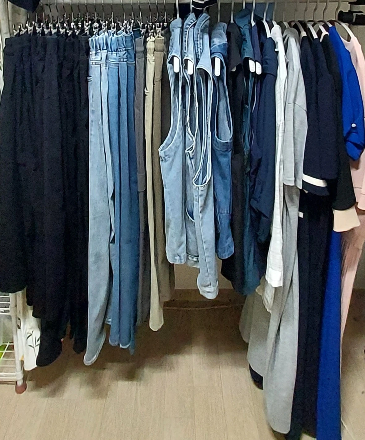 옷을 걸 때 나름 규칙을 정해봤다. 상, 하의 모두 같은 방향으로 거는 것. 우리 집 옷들은 앞쪽을 향하게끔 걸려있다.