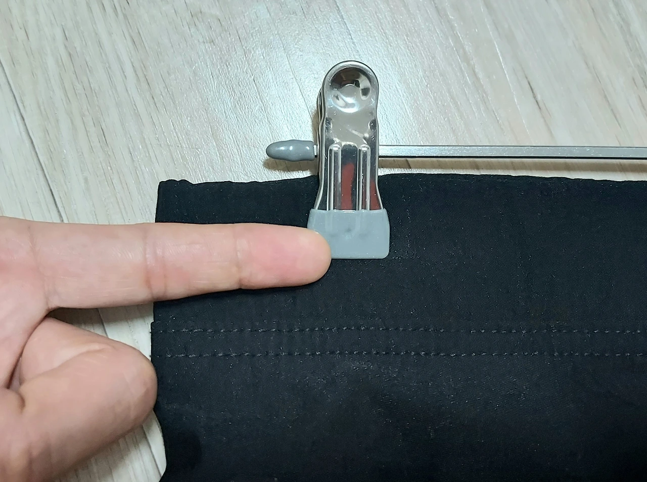 둘째와 셋째 손가락 사이에 바지를 넣어 길이를 가늠하면 쉽고 빠르게 옷을 집을 수 있다.