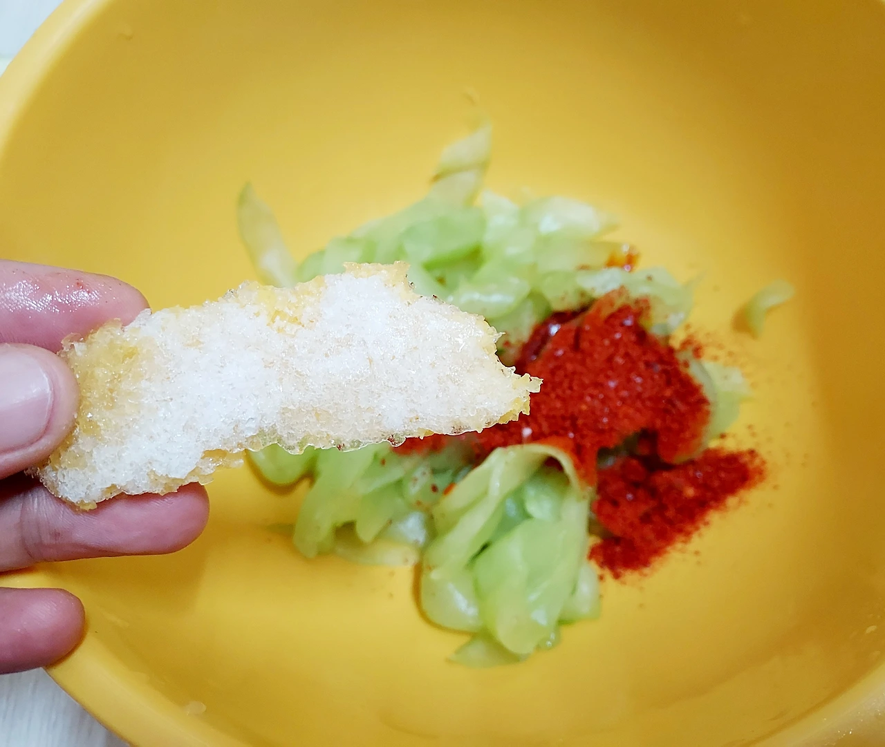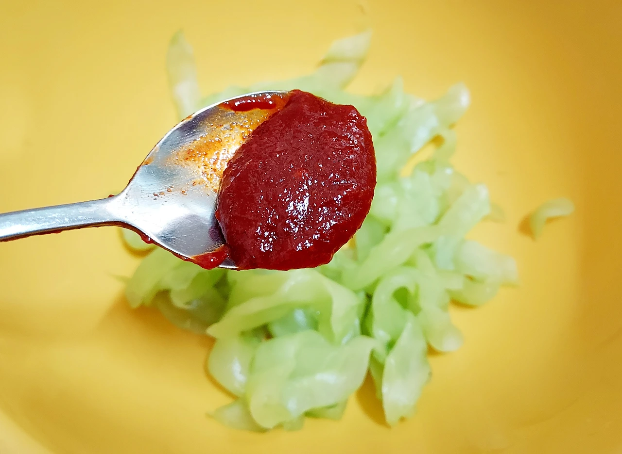 고추장 반수저, 고춧가루 반수저 또는 평평하게 한 수저, 마늘 약간. 매실액 한 수저(매실액을 쓰지 않는다면 올리고당과 식초 반수저씩)