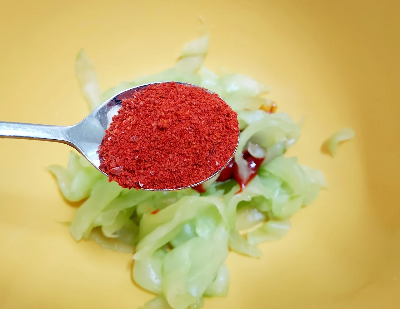 수분을 뺏겨 한주먹으로 줄어든 노각을 양념해 보자. 난 노각을 무쳤을 때 물이 덜 생기고, 뻘건 빛깔을 내기 위해 고추장과 고춧가루를 섞어 쓴다.