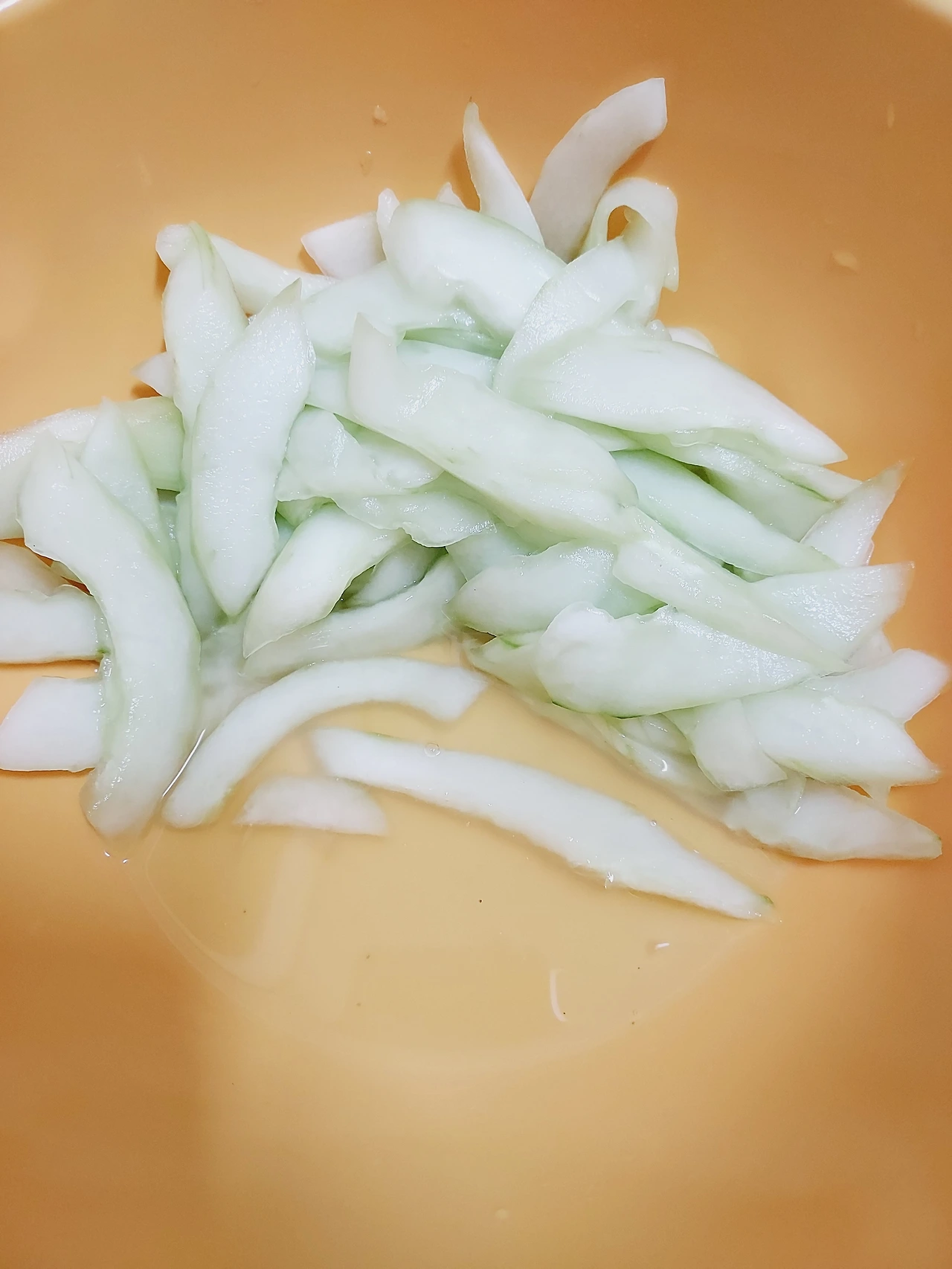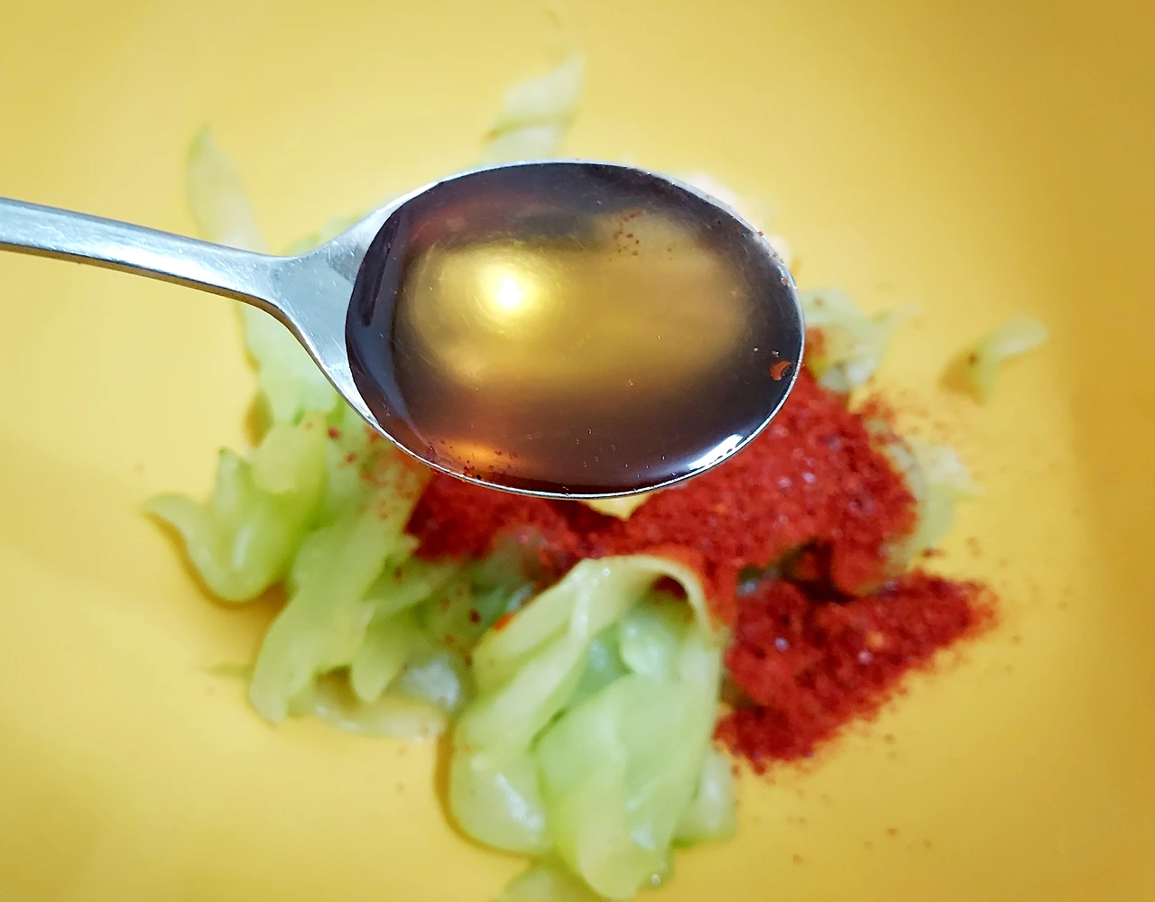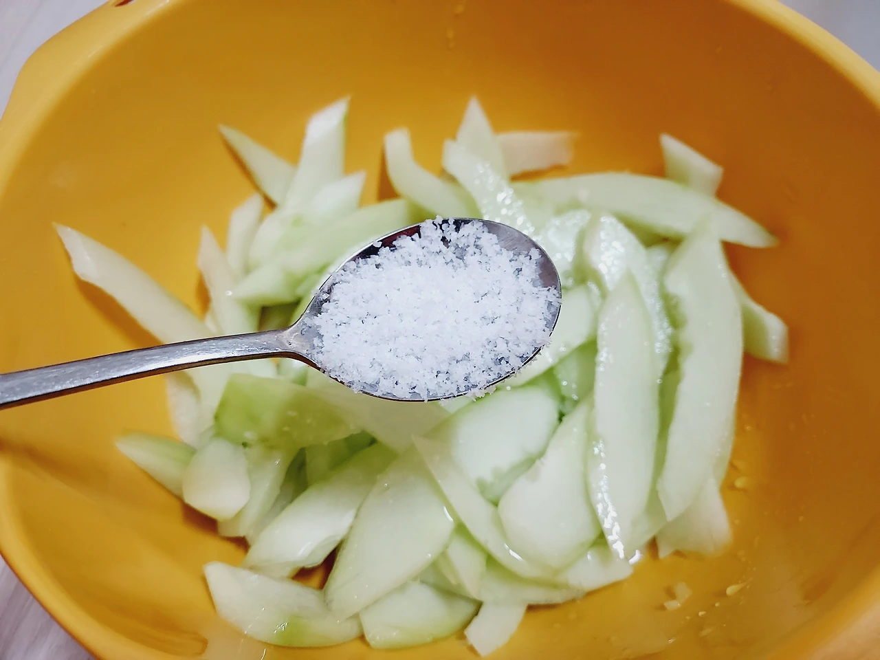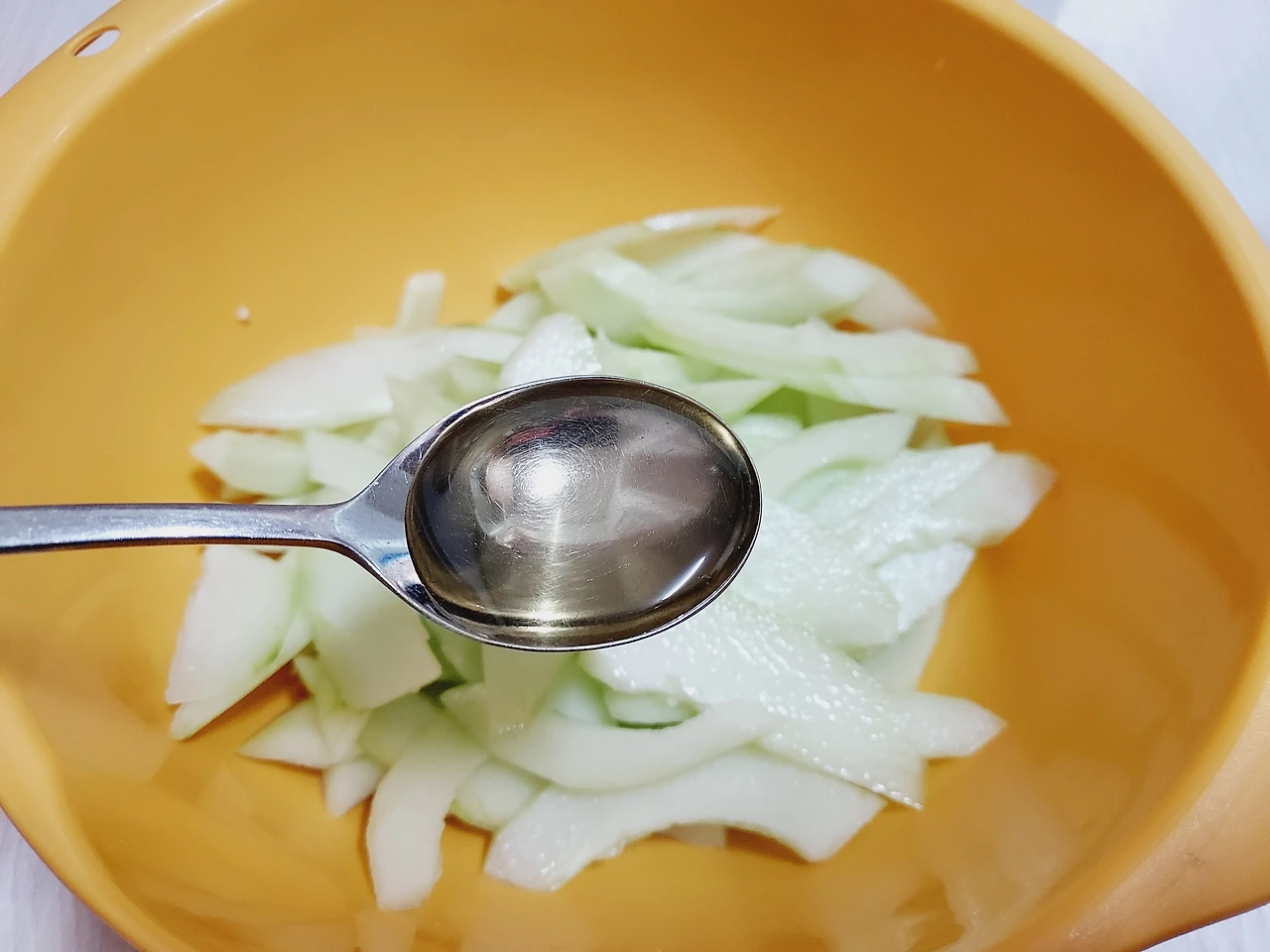 노각이나 오이 무침을 할 때 설탕+소금보다 물엿 또는 올리고당+소금 조합이 수분을 더 잘 빼서 그렇게 하고 있다. 올리고당 두수저, 꽃소금 반수저 넣고 고루 섞은 뒤 30~40분 절이기.