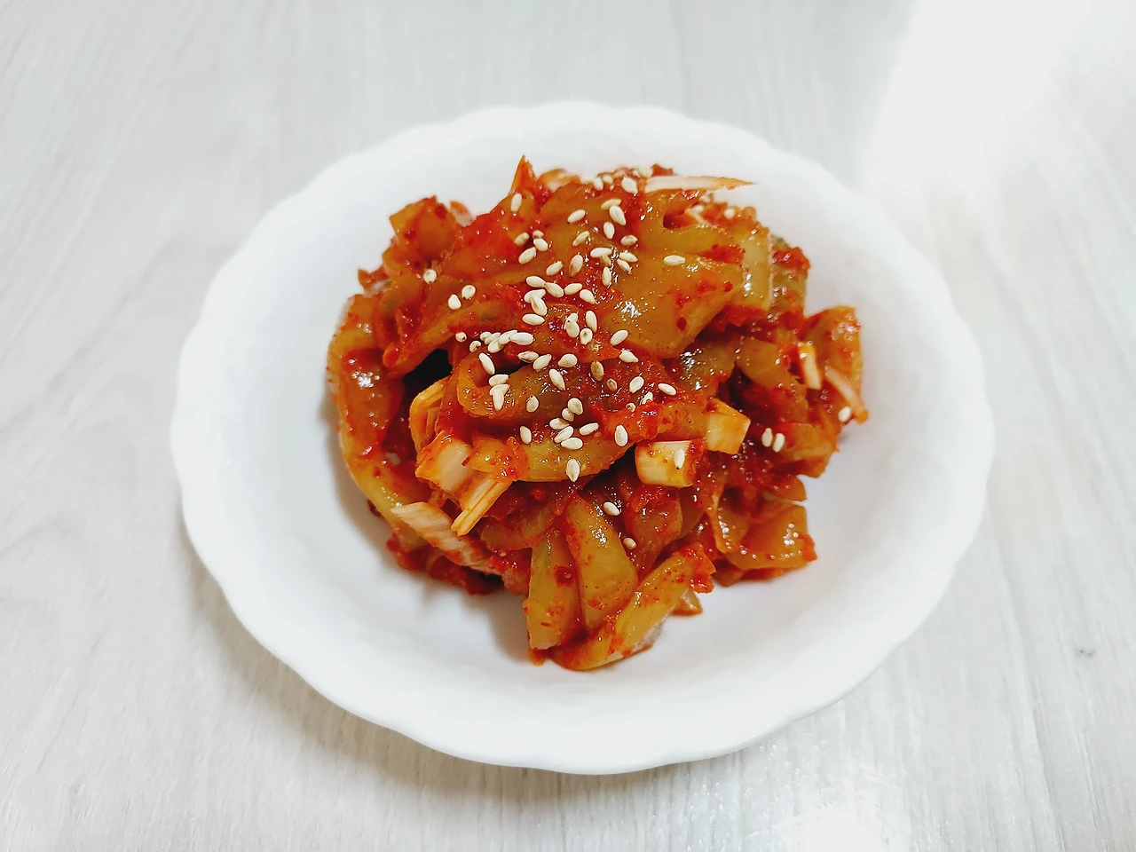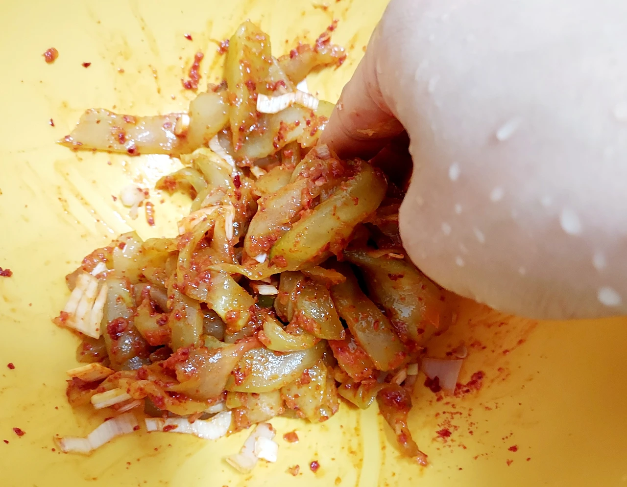 다진 파 약간 넣고 양념이 잘 배이도록 바락바락 무치기. 맛보기 하고 부족한 간은 소금으로. 마무리는 깨소금으로.