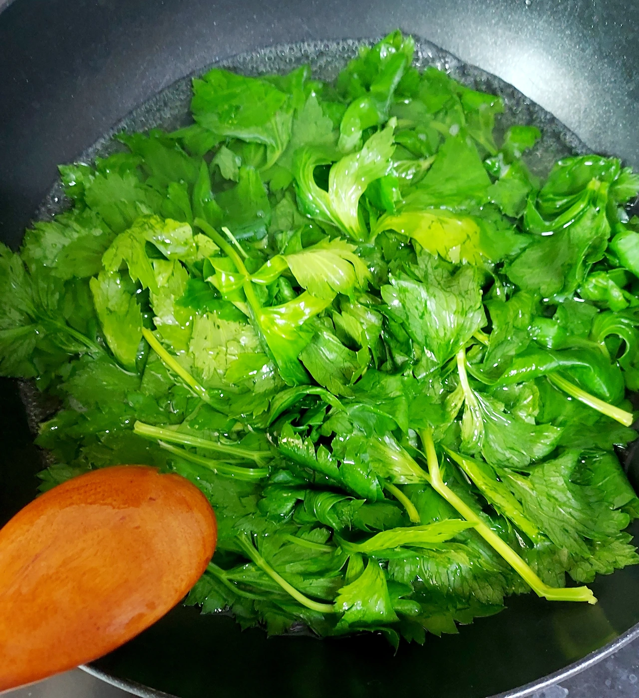사람마다 입맛이 다르겠지만, 내 경우에는 줄기무침이 중독성이 있다고나 할까. 꼭꼭 씹을수록 입안에서 퍼지는 쌉싸래한 맛과 향이 끌린다. 시금치 무침 같이 생겨서 분위기는 완전히 다른 샐러리 잎무침. 지금은 줄기보다 잎이 더 맛있다.