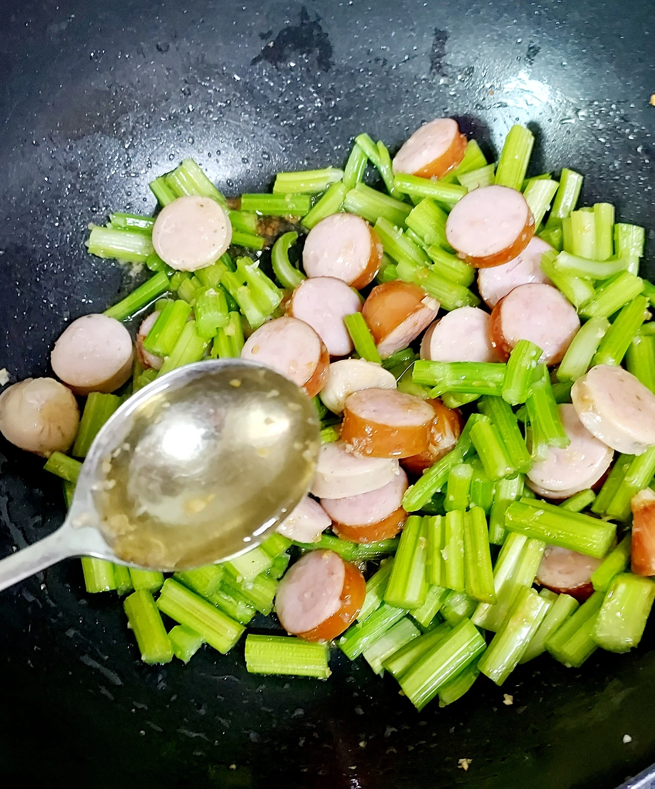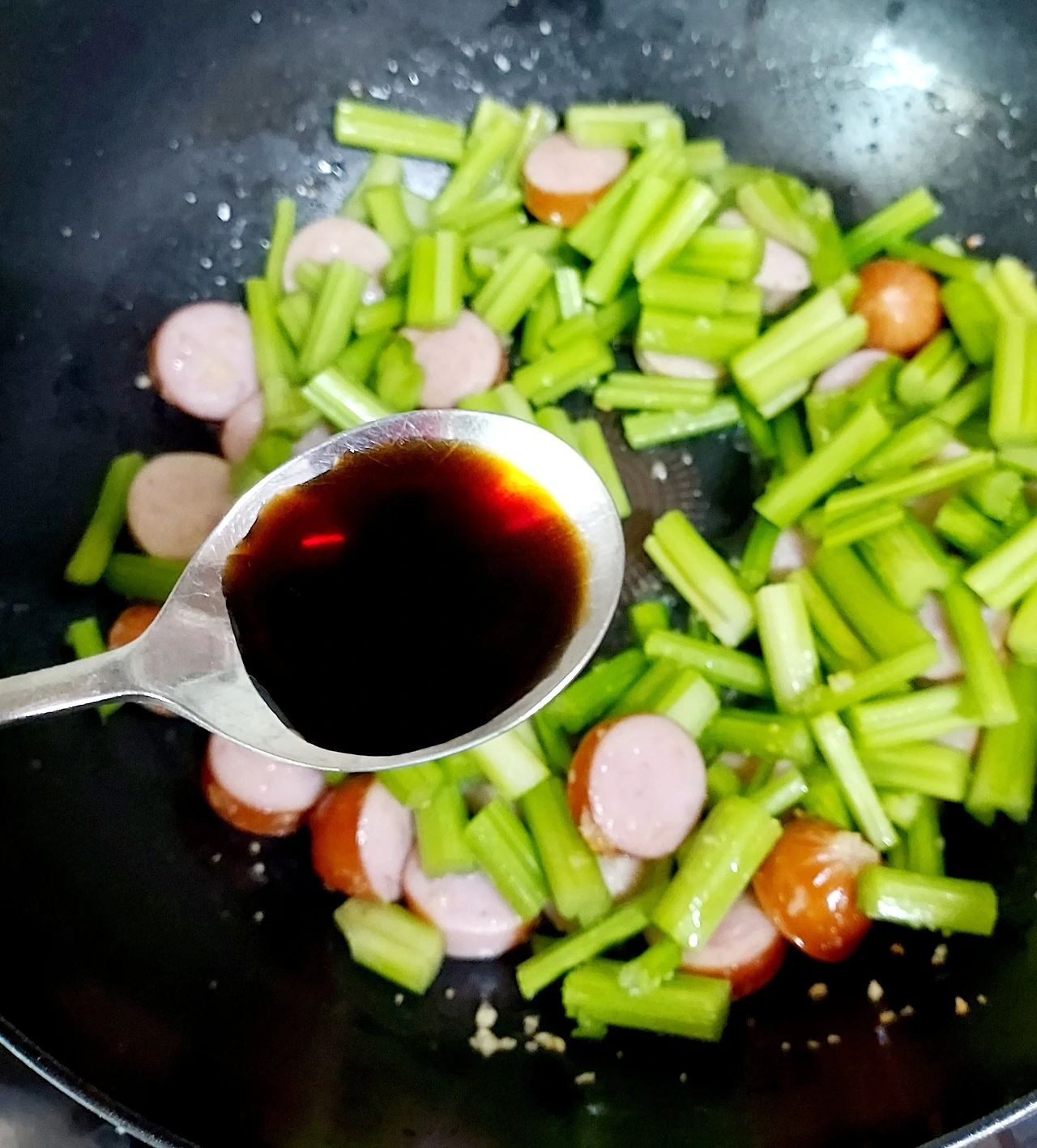 샐러리 줄기를 넣고 볶다가 진간장 반숟가락 넣는다. 진간장 대신 굴소스를 넣어도 OK! 바로 이어서 올리고당 한수저 넣기.