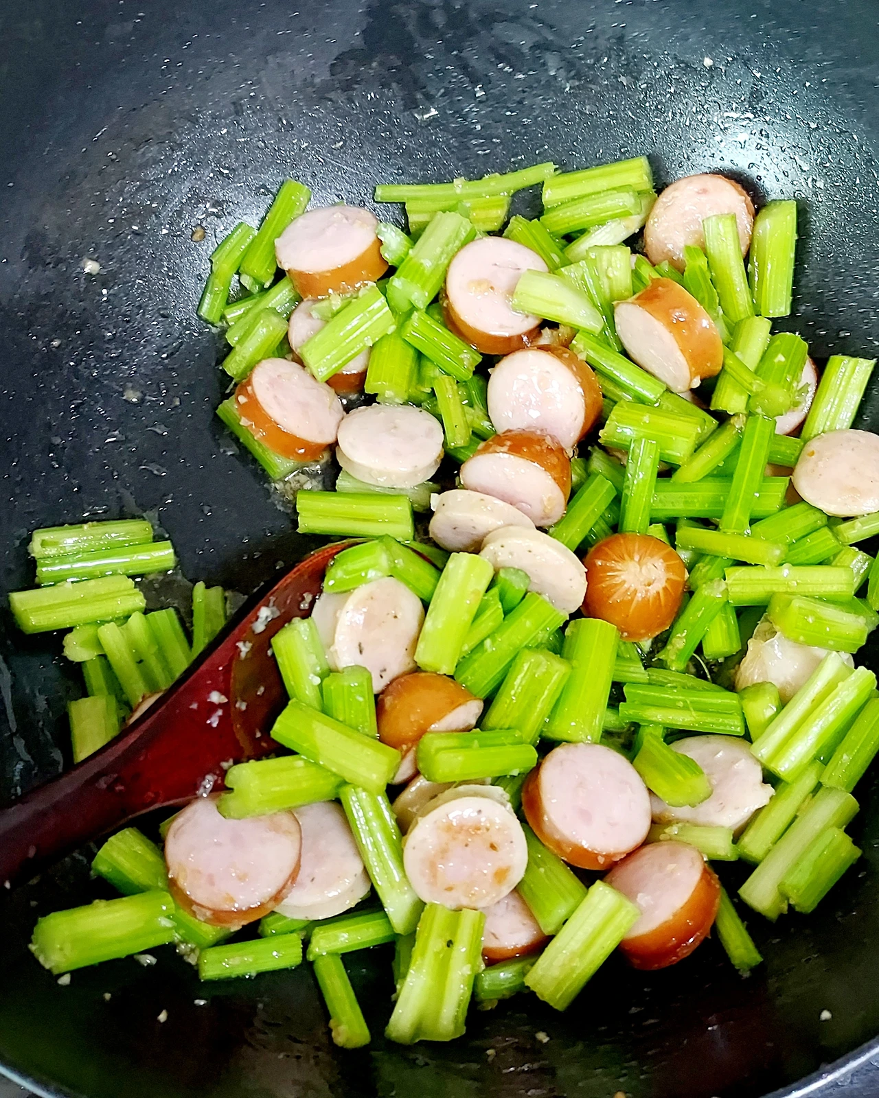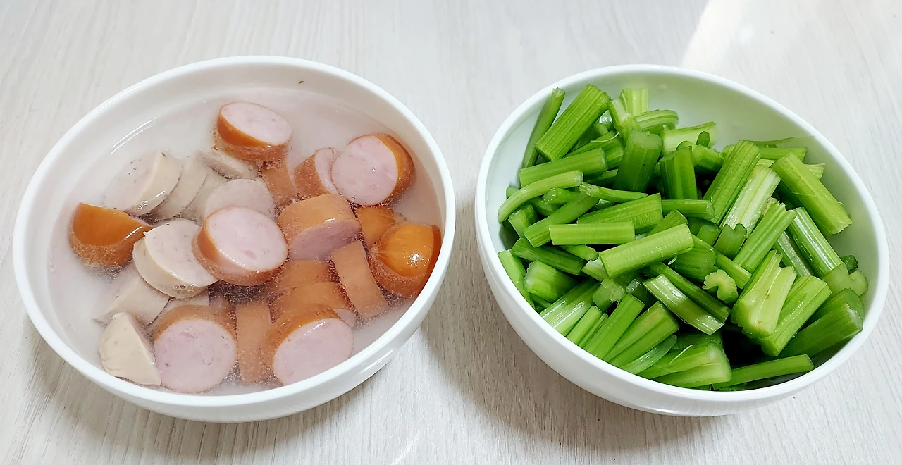 샐러리 줄기로 볶음요리 할 때 프랑크소시지를 주로쓴다. 3개를 적당한 크기로 썰어 뜨거운 물에 담가 기름기를 빼준다. 샐러리 줄기도 한입 사이즈로 자르기.(두 개 모두 국그릇 하나 분량)