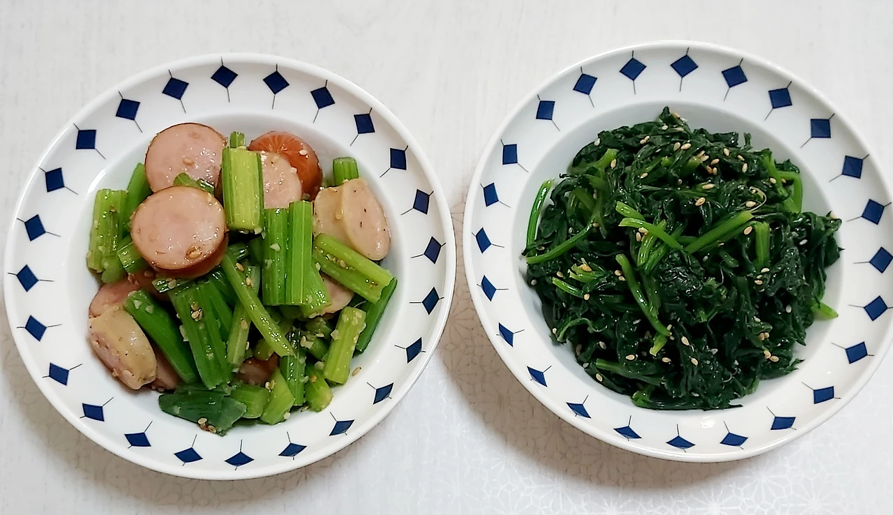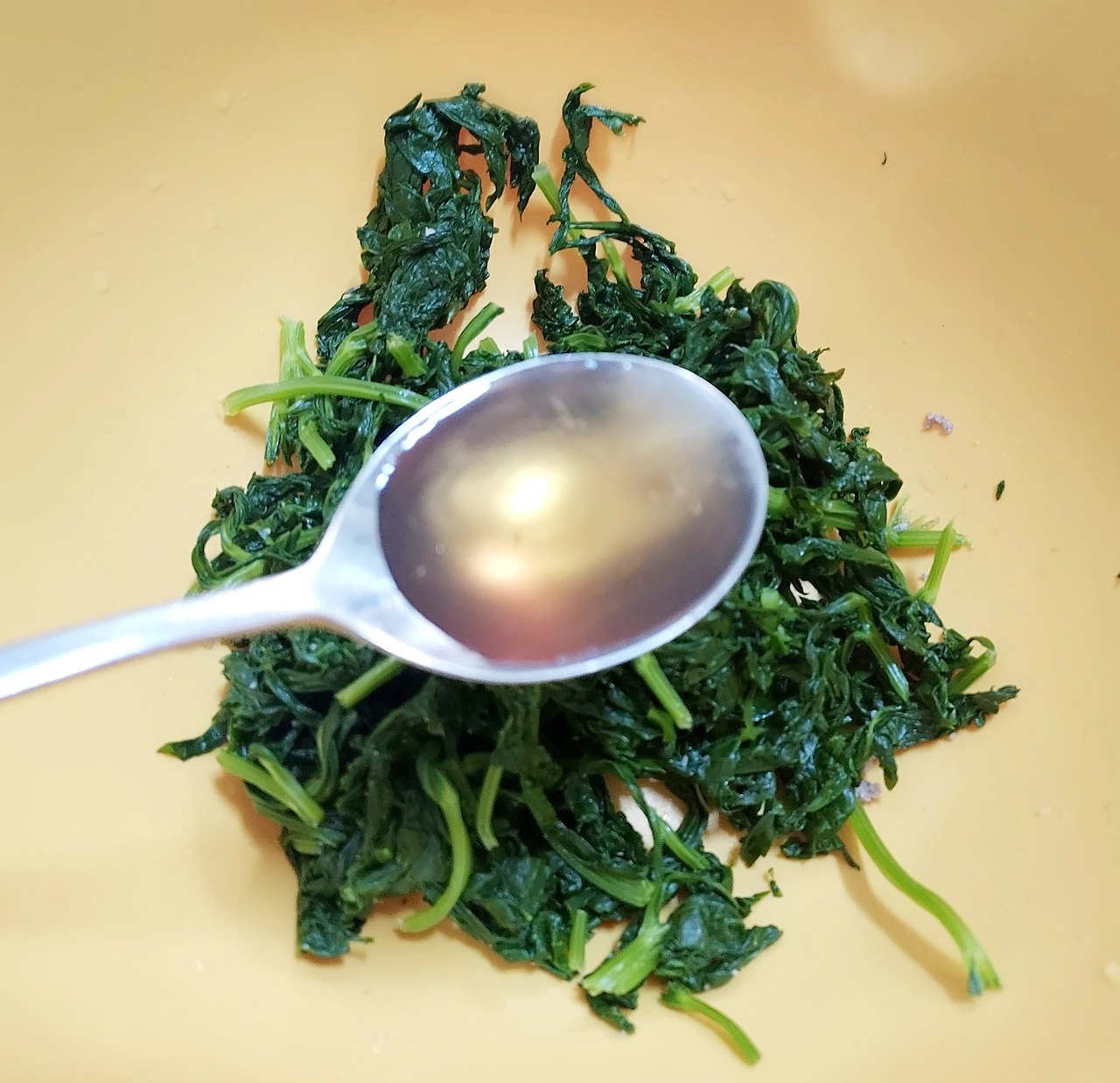 들기름 또는 참기름, 깨소금 넣고 조물조물 무치면 완성.줄기 볶음에는 소시지가 들어가 마늘을 약간 넣었는데, 잎무침은 향이 강해 넣지 않았다.