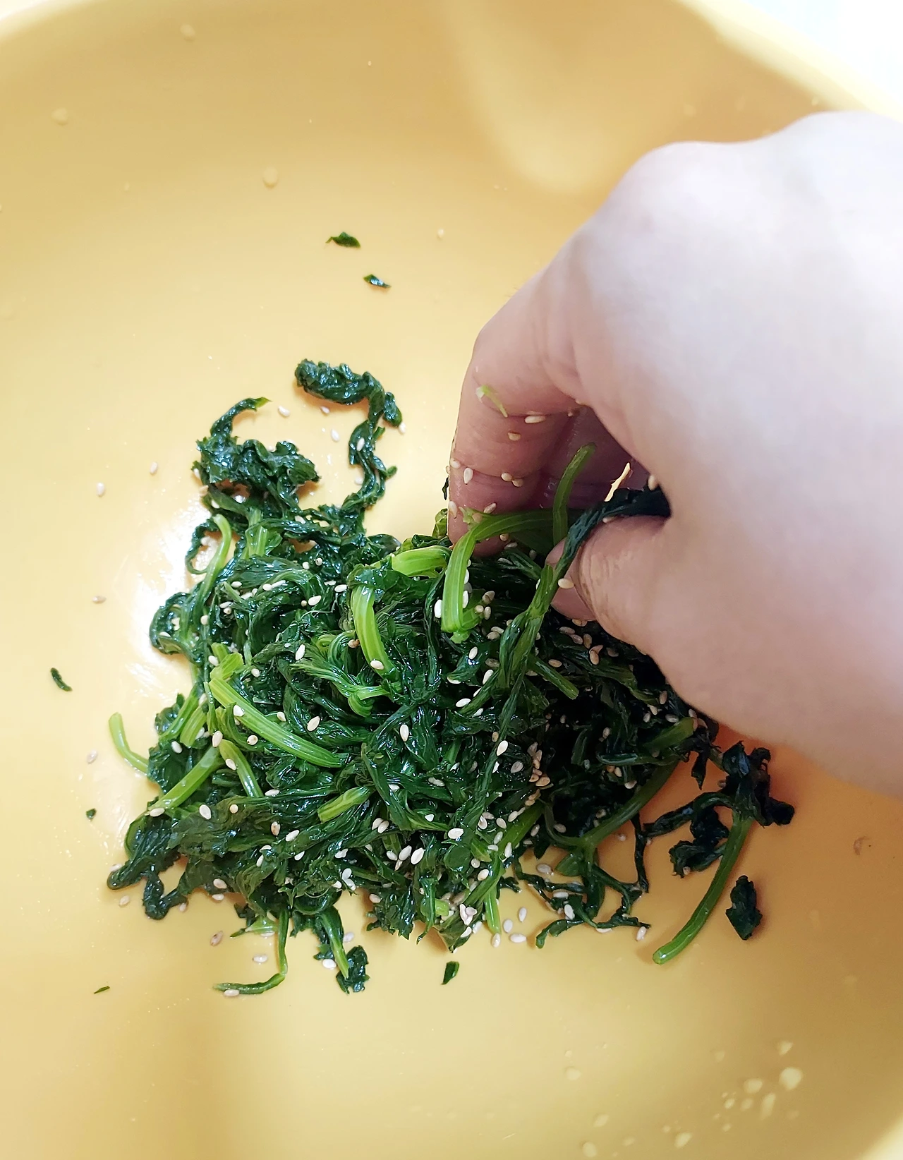 그냥 먹어도 되는 채소를 오래 볶으면 빛깔만 칙칙해지니 양념 넣으면 강불에서 30초 정도 볶다가 불 끄기. 들기름 또는 참기름 넣어 섞고, 깨소금 뿌려 접시에 담아보자.