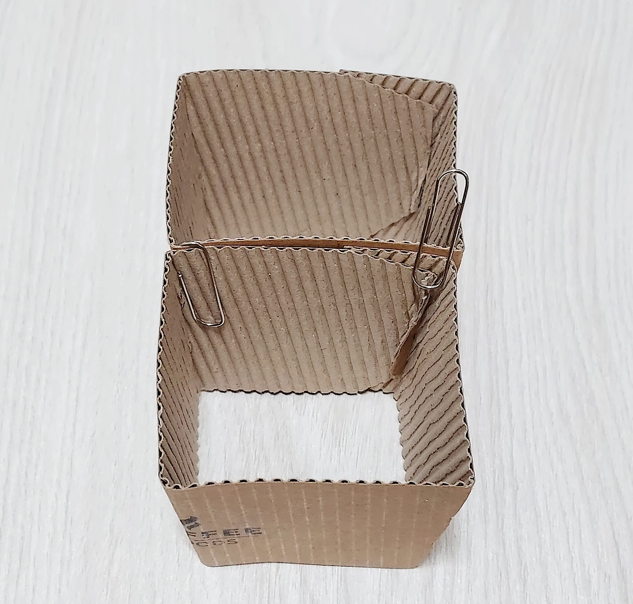 접은 선대로 각을 잡으면 사각형 모양이 나온다. 티백 종류에 맞게 사각형을 여러 개 만든 뒤, 각각의 컵홀더 윗부분을 클립으로 연결하면