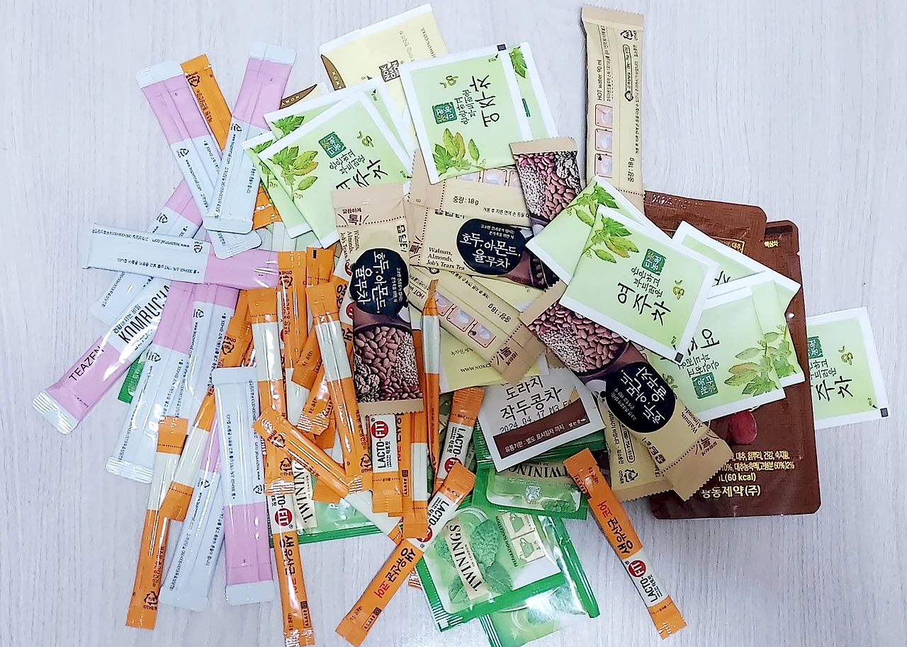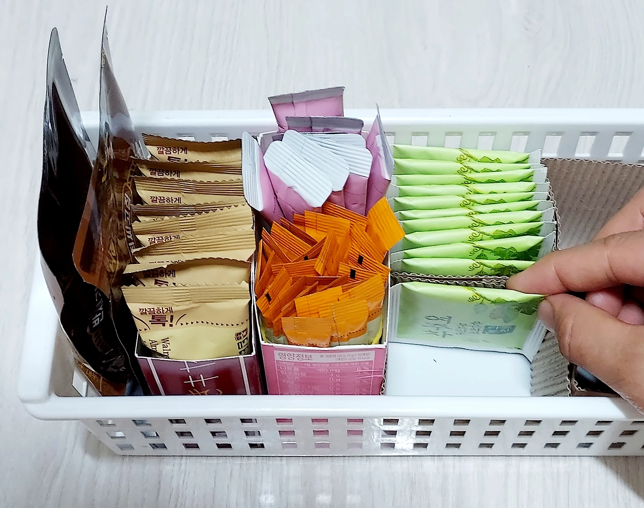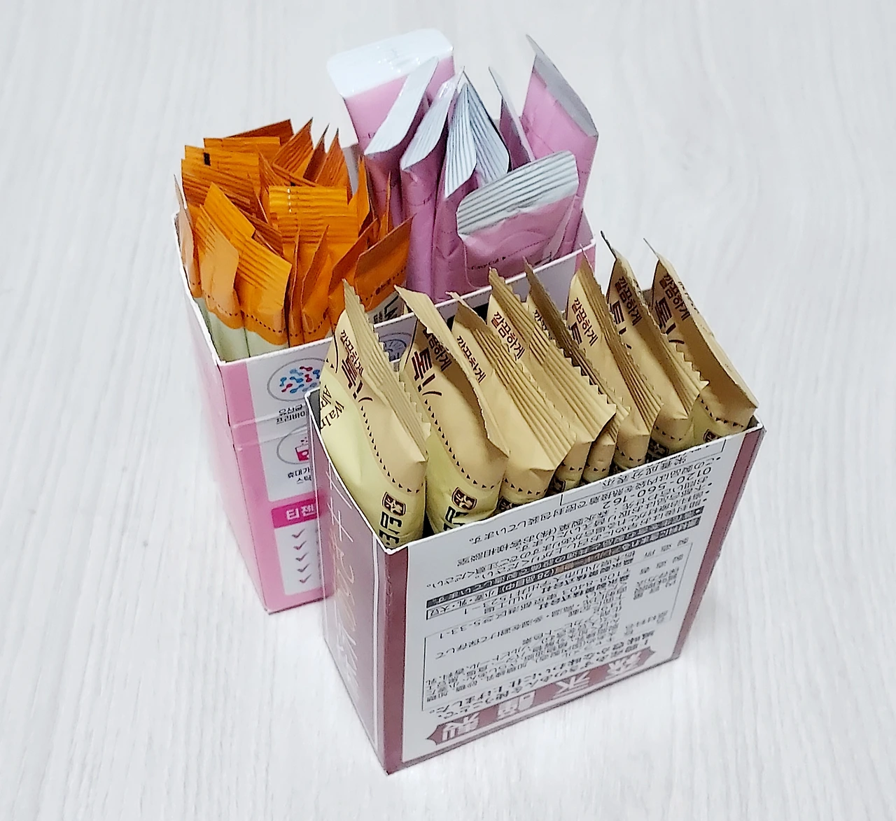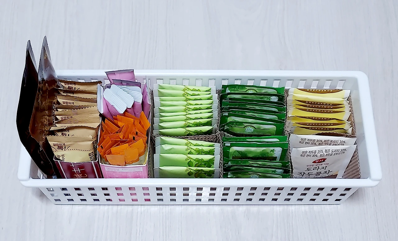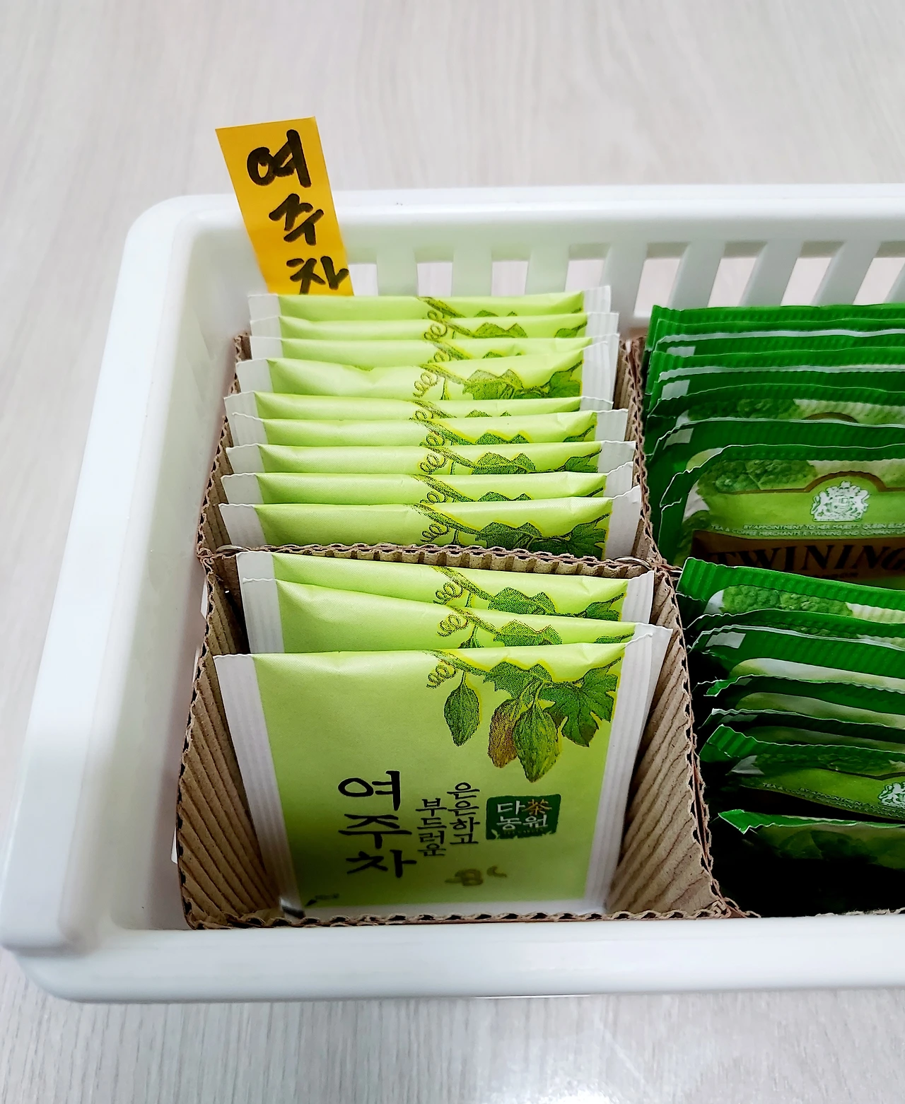 우선 쓰임새가 같거나 비슷한 물건을 분류한다. 난 스틱형 3종류, 티백형 4종류, 팩 1종류로 크게 나뉜다.종류가 많지 않아 유산균 스틱과 쌍화차 팩을 포함시켰다.