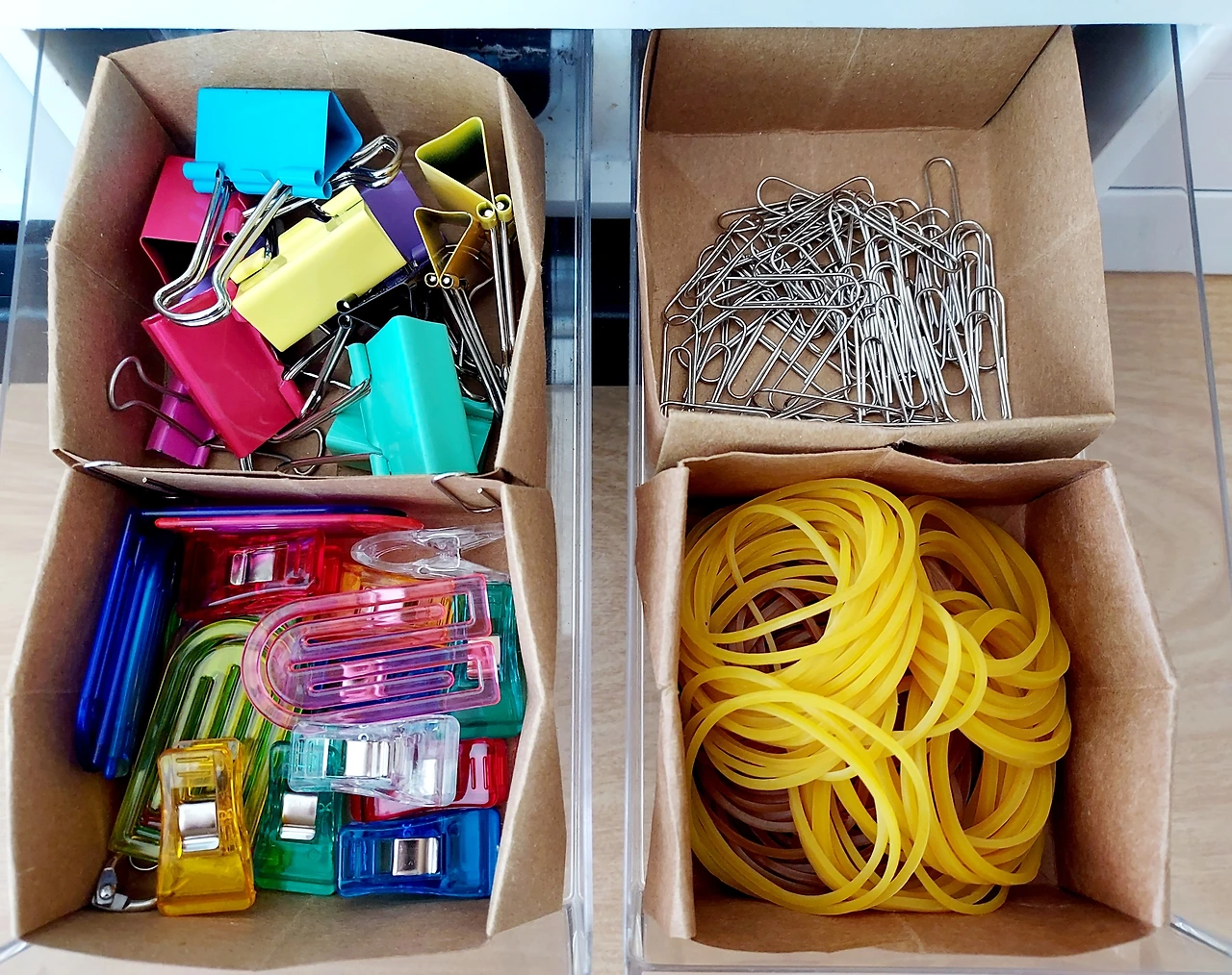 이건 우리 집 컴퓨터 책상 위에 설치한 문구류 보관서랍이다. 흩어지기 쉬운 작은 문구 용품들을 종류별로 담아 보관하고 있는데, 티백차 정리도 이와 크게 다르지 않다.