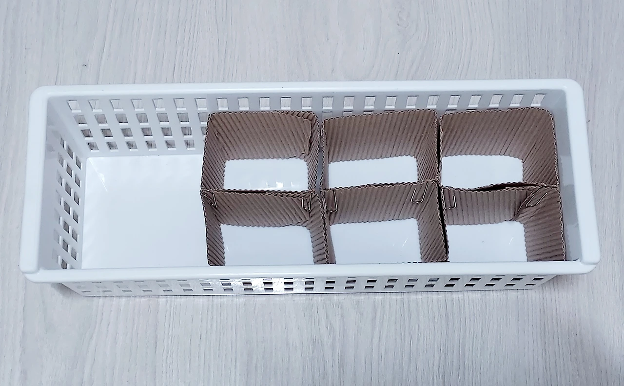 컵홀더를 활용한 정리수납은 수납용품의 크기에 따라 얼마든지 확장할 수 있다. 위의 사진처럼 크기가 있는 수납용품을 사용할 때 컵홀더를 연결해서 공간을 채워나간다.