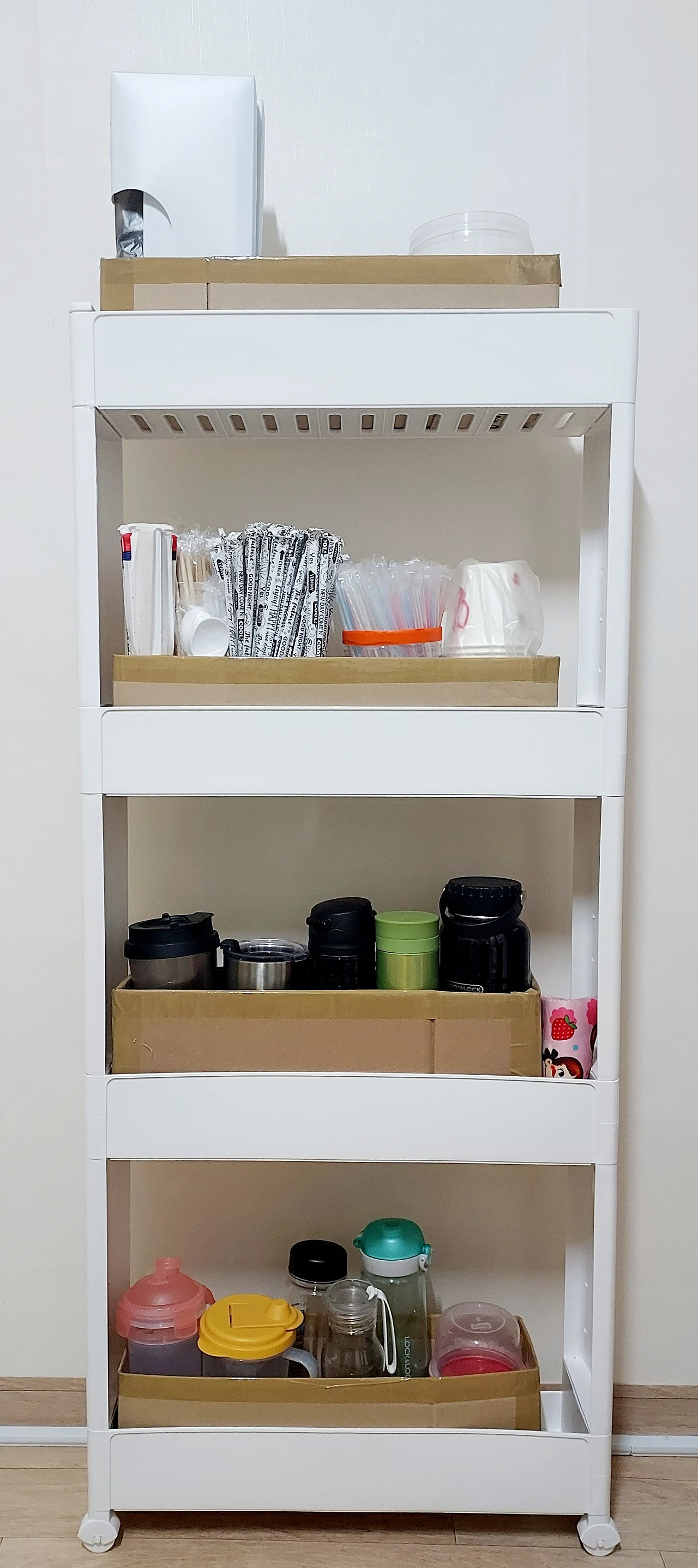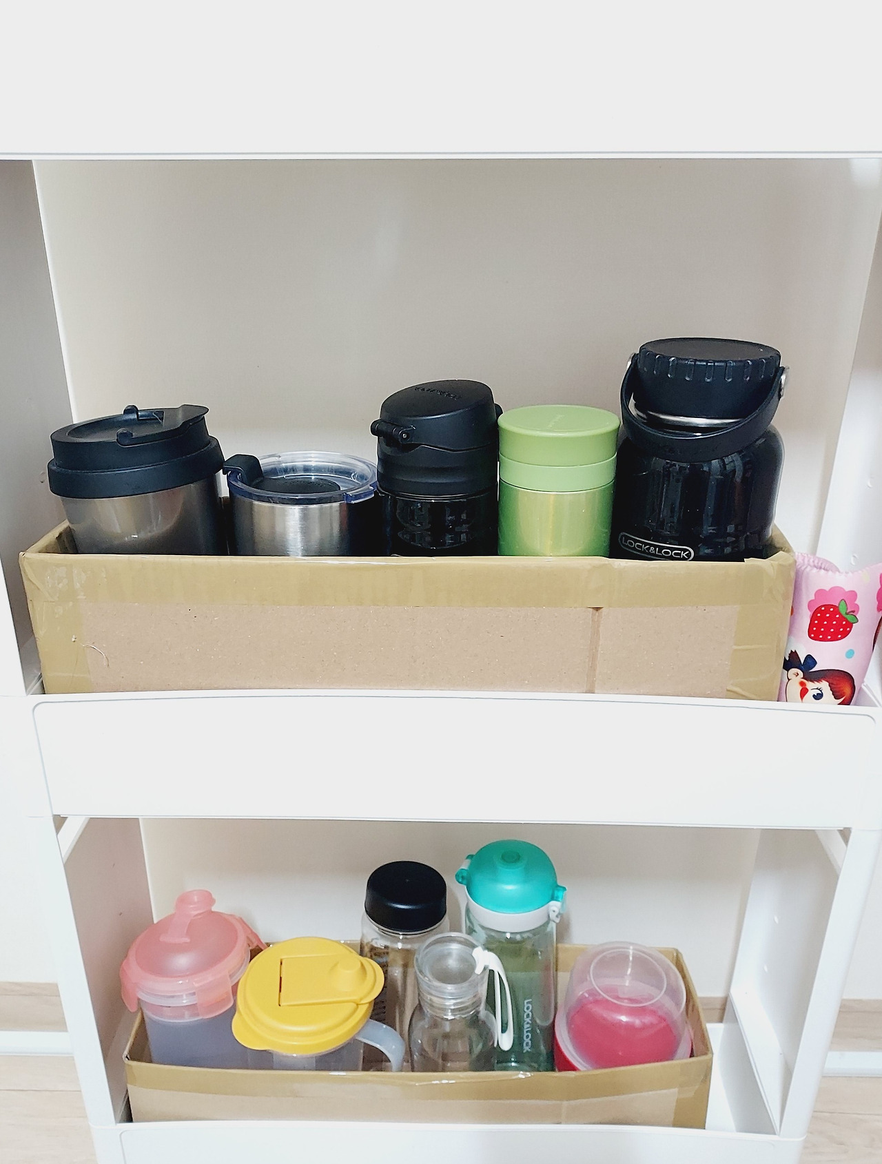 특히 텀블러와 물병처럼 쓰러지기 쉬운 애들은 바구니나 박스에 담아주는 것이 좋다.