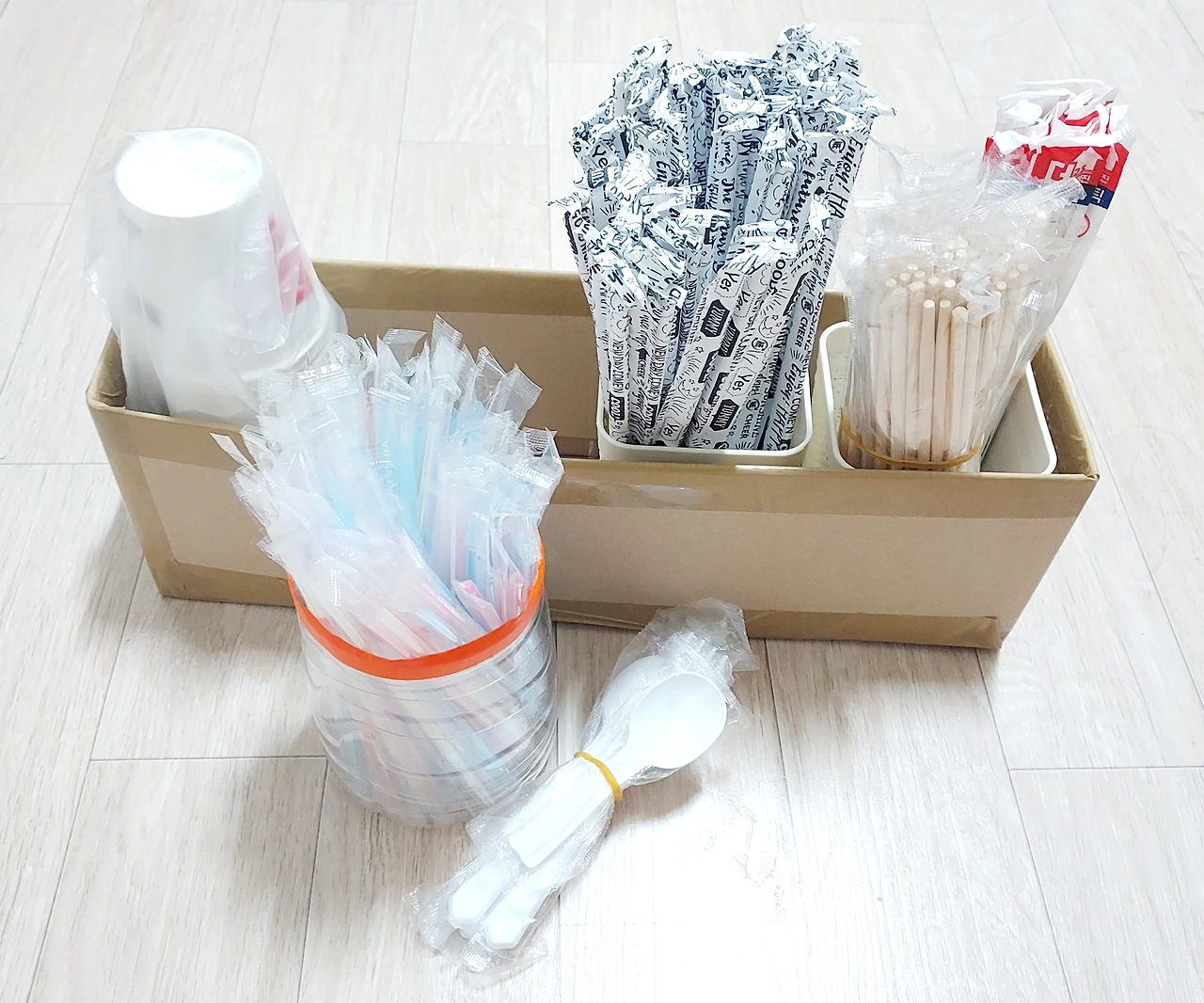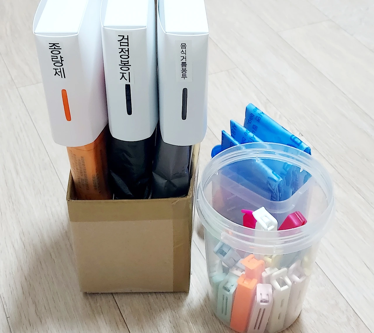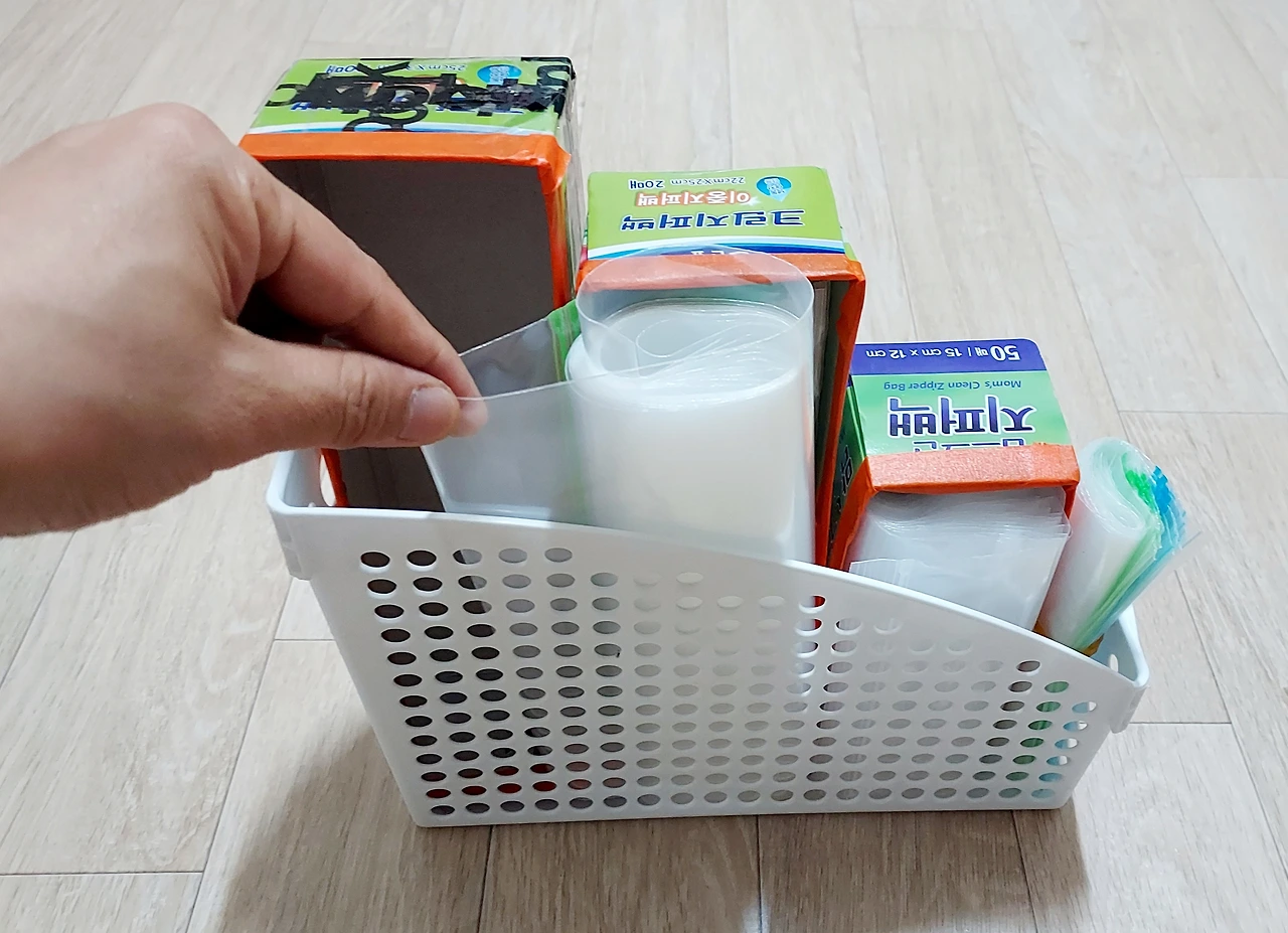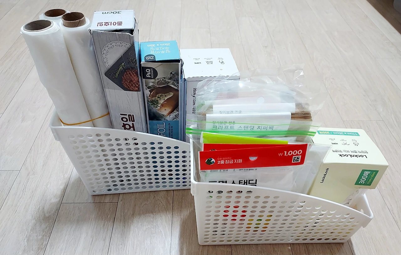 일회용품들은 종류별로 깊이 있는 바구니에 담아 쓰러지지 않고 골라 쓰기 편하게 정리했다. 사진 오른쪽 지퍼백의 경우 제품 상자의 윗부분을 오려 떨어질 때마다 보충할 수 있도록 했다. 크기별로 정리하면 뽑아 쓰기도 편리하다.