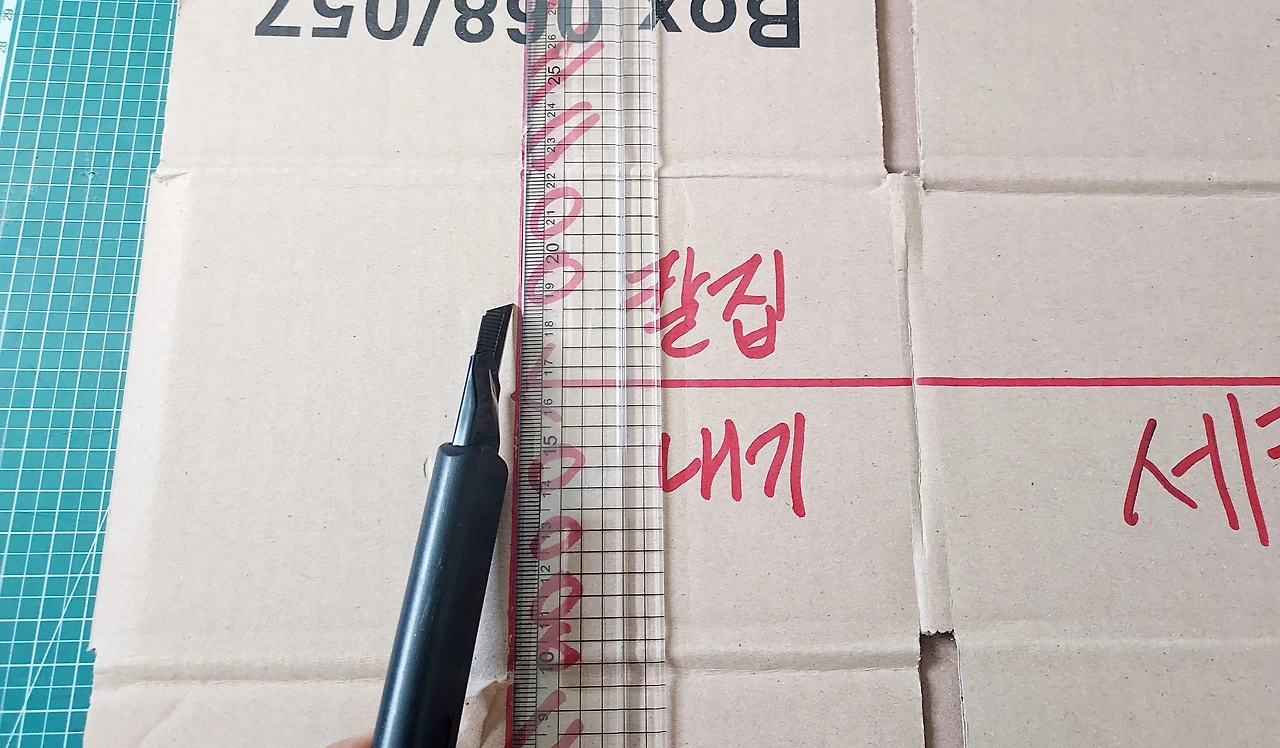 왼쪽 사진의 빨간색 부분 중 위쪽, 아래쪽은 자르고, 가운데 부분은 칼로 살짝 긋기해 접기 편하도록 해준다.
