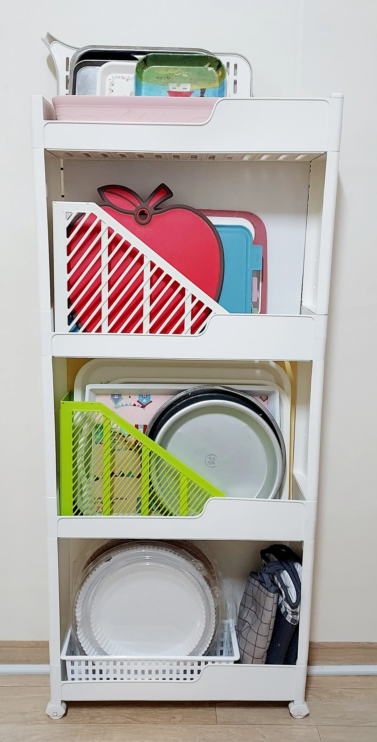 우선 싱크대 바로 옆에 놓을 수납장(사진 왼쪽)에는 쟁반과 도마를 메인으로 했다. 채소를 다듬거나, 음식을 조리할 때 빈번하게 쓰이는 것들이라 싱크대와 가까운 곳에 있는 게 낫겠다는 생각이 들었다.