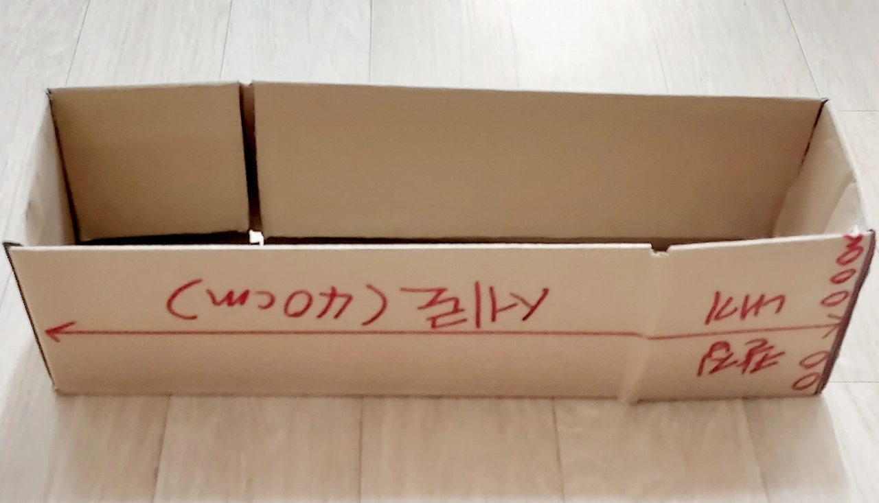 박스 접기를 하기 전, 해당 박스를 접었을 때 수납장에 들어가는지 알아보는 과정이 필요하다. 우리 집 틈새수납장의 경우 가로 13cm(물건이 들어가는 실측 사이즈는 12.5cm), 세로 44.5cm가 나온다. 박스 펼침면 중 파란색, 빨간색 부분이 수납장 사이즈보다 작다면 접었을 때 수납이 가능하니 확인해 보도록 한다.