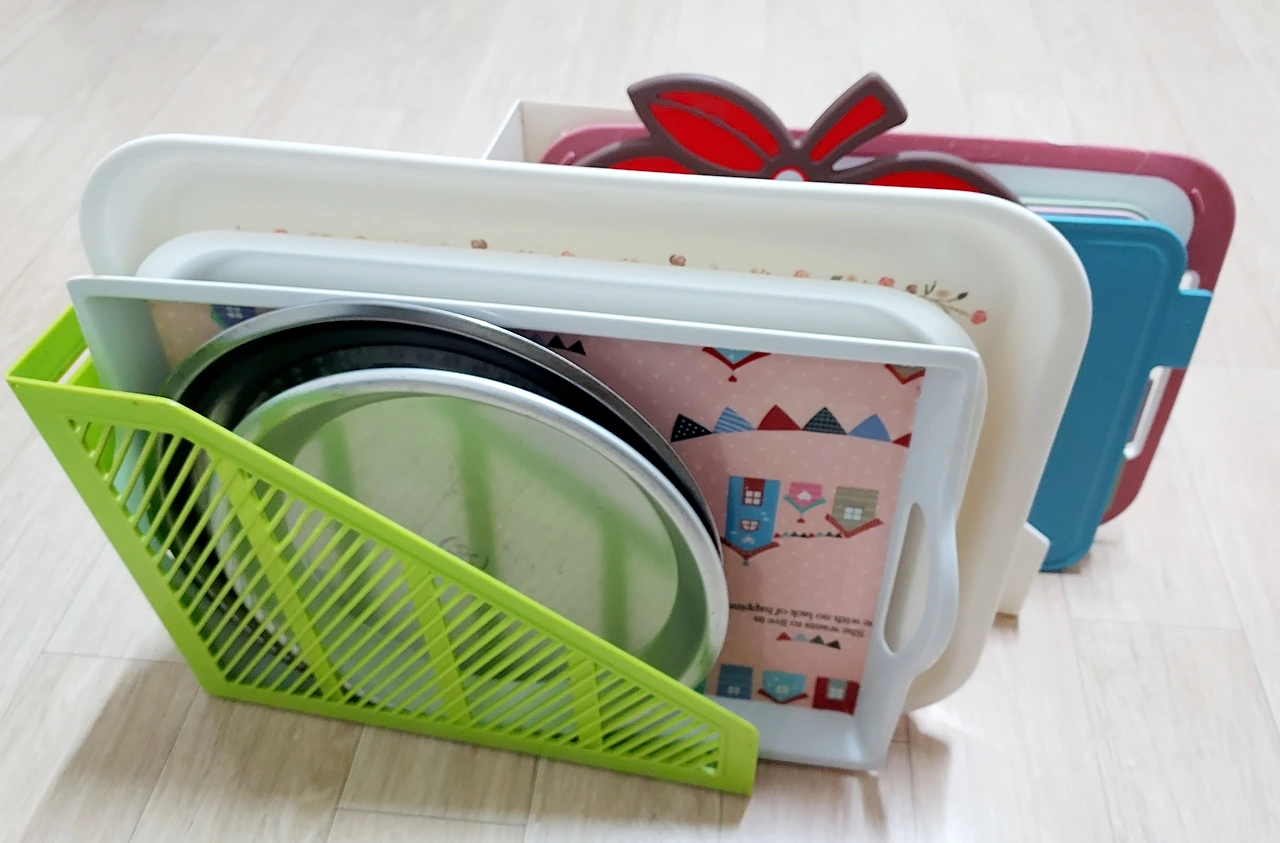 도마와 쟁반의 경우 크기와 무게가 있어 수납장 안에서 쓰러지지 않게 해주는 것이 중요하다. 이때 요긴하게 쓰이는 게 책꽂이. 가로로 눕혀 하나씩 정리해 주었다.