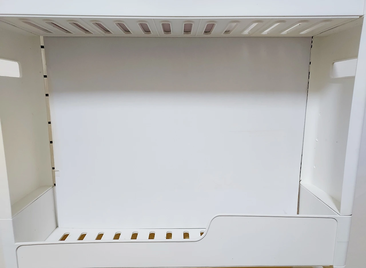 틈새수납장은 양쪽 모두 뚫려 있어 도마와 쟁반은 꺼내는 곳 반대쪽으로 물건이 넘어갈 수 있다. 이에 반대쪽에 튼튼한 하드보드지로 일종의 벽을 만들어 넘어가기 방지!