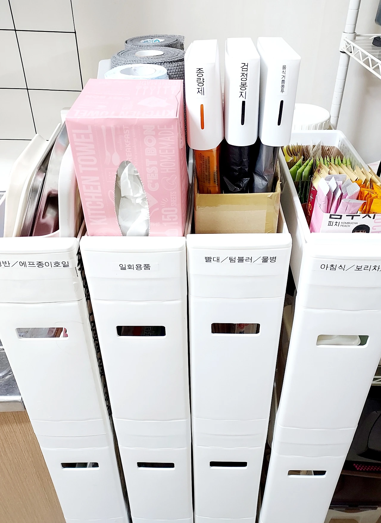 틈새수납장에 주방용품을 정리할 때 가장 신경 쓴 점은 개별 물건들이 서로 섞이지 않게 자리를 잡는 것이었다. 봉투, 집게, 빨대 등 개수가 많은 용품은 작은 바구니 등을 이용해 분류하고, 분류한 것들은 다시 종이 박스에 담아 수납장 내부에서 이동하지 않게끔 해주는 것이다.