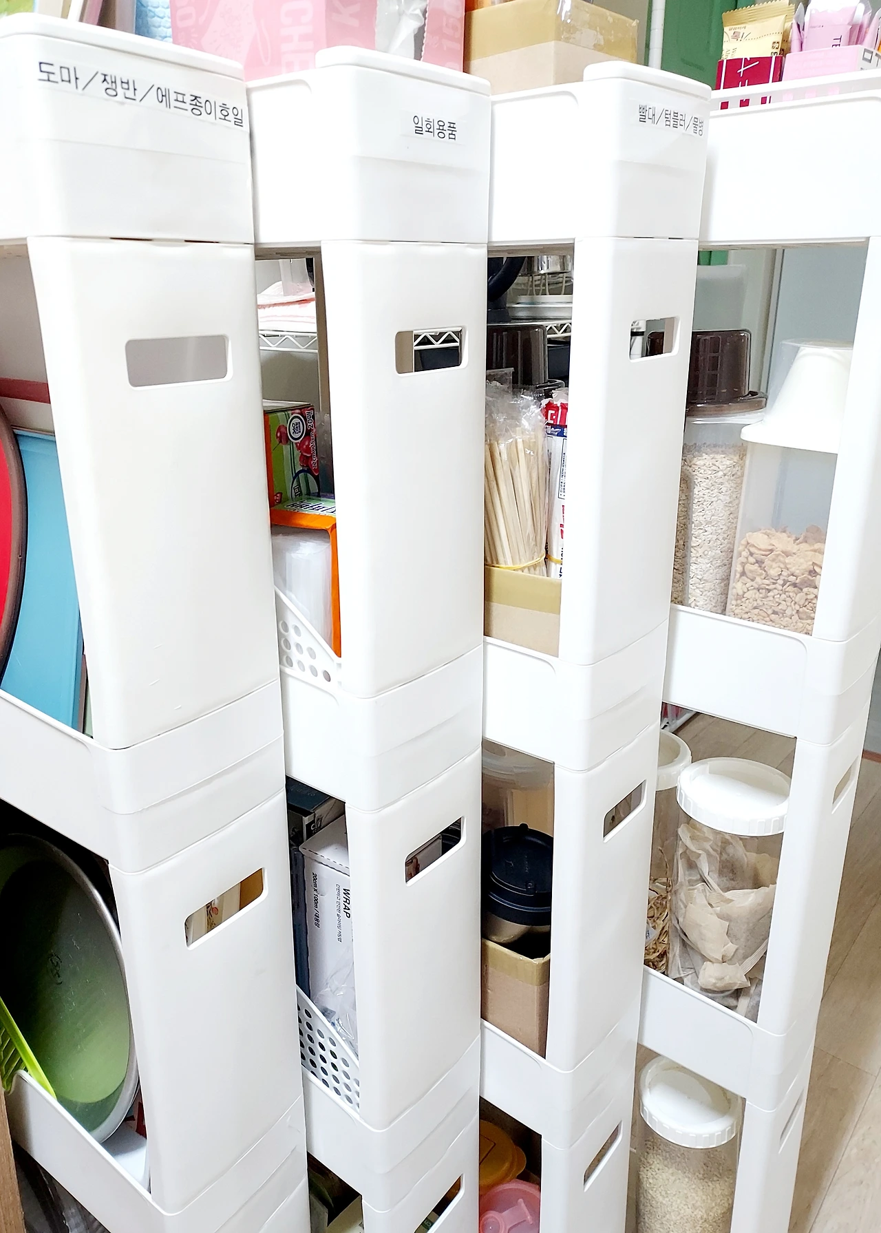 틈새수납장 4개는 싱크대 바로 옆에 설치해 쓰고 있다. 처음에는 4개에 어떤 종류의 주방용품을 넣고, 그 순서는 어떻게 배치할 것인지 많이 생각했었다.