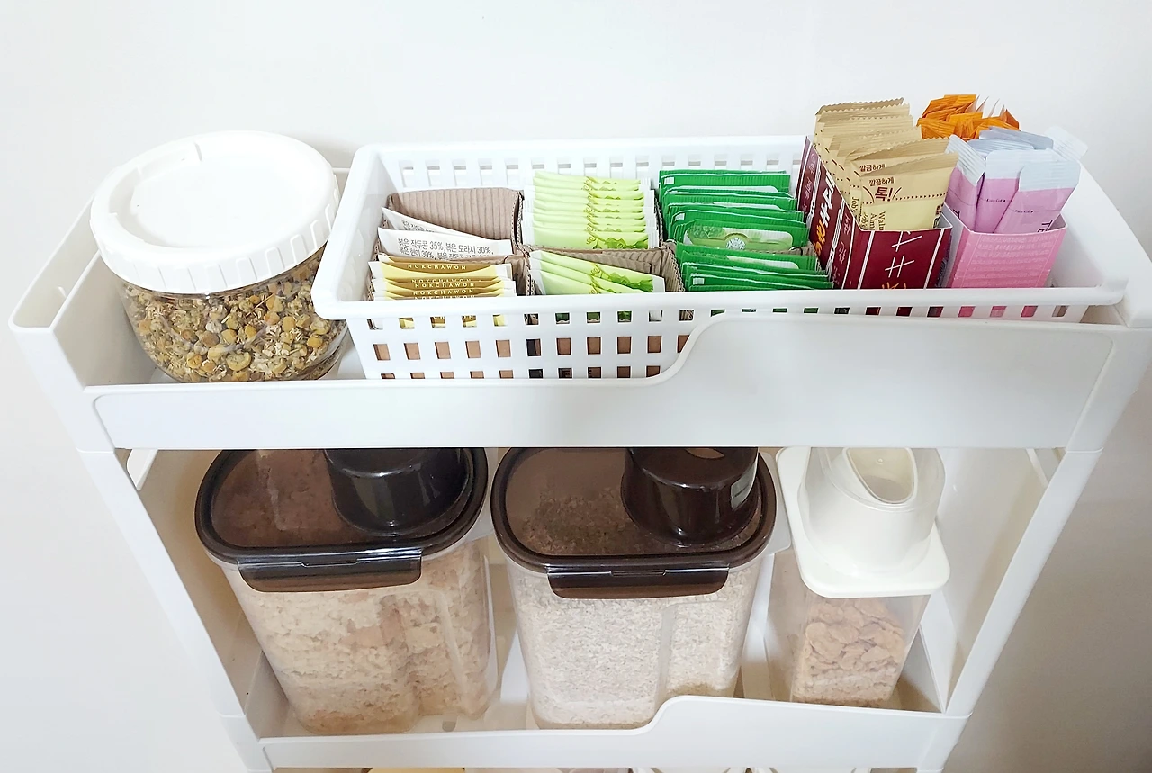 차와 곡물을 보관한 수납장에서 자주 먹는 차류는 잘 보이고 꺼내기 쉽도록 꼭대기층으로 올렸다. 티백차 정리는 일전에 소개한 내용을 참고하시길.