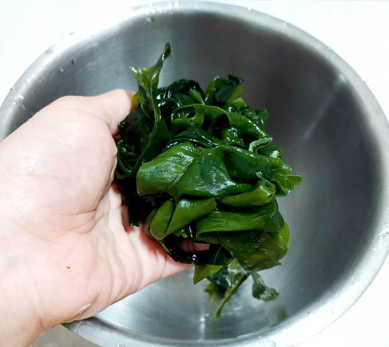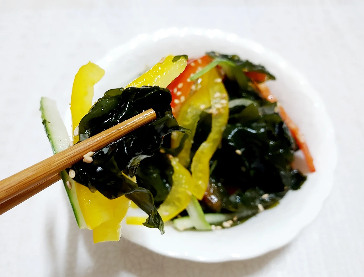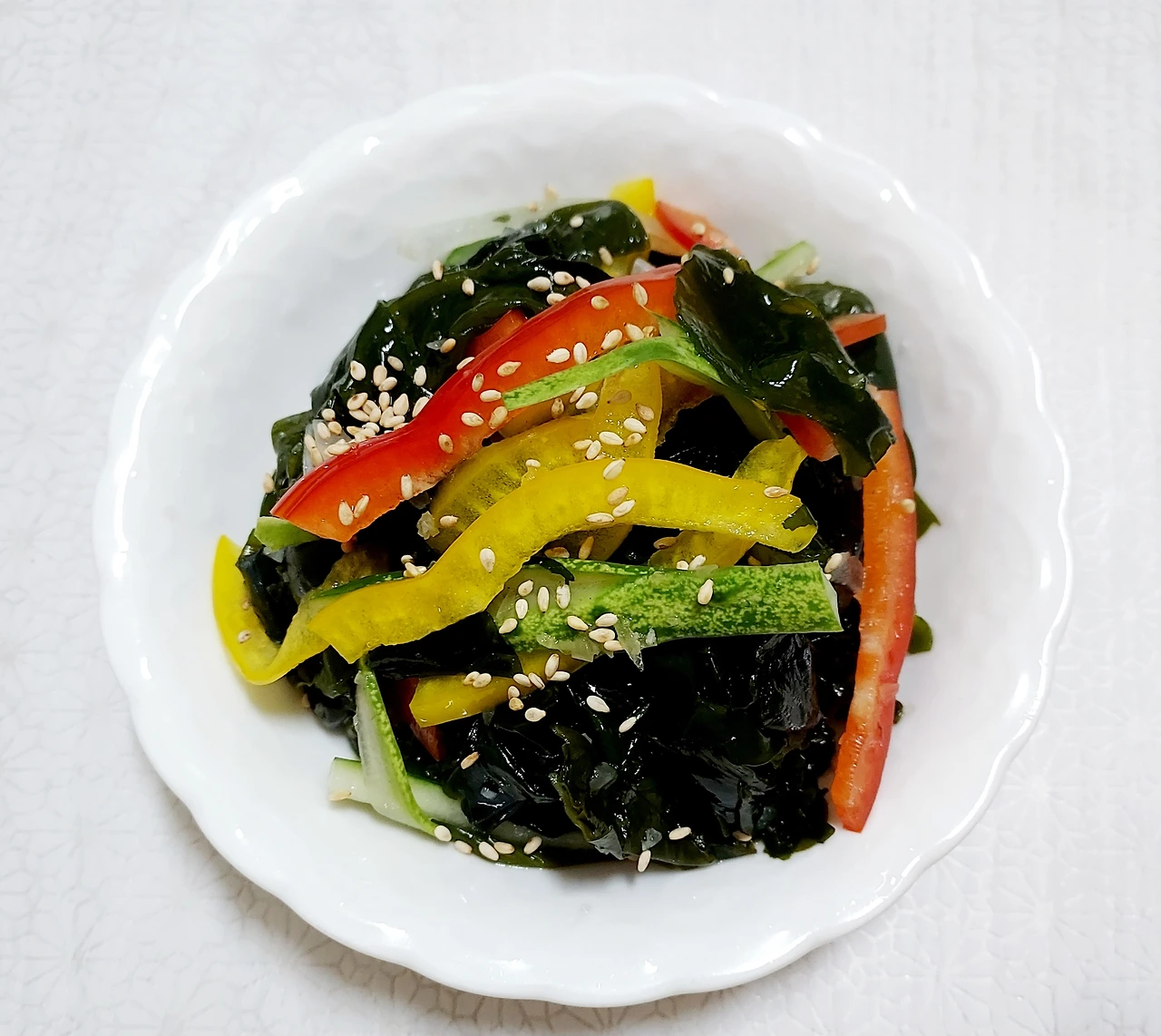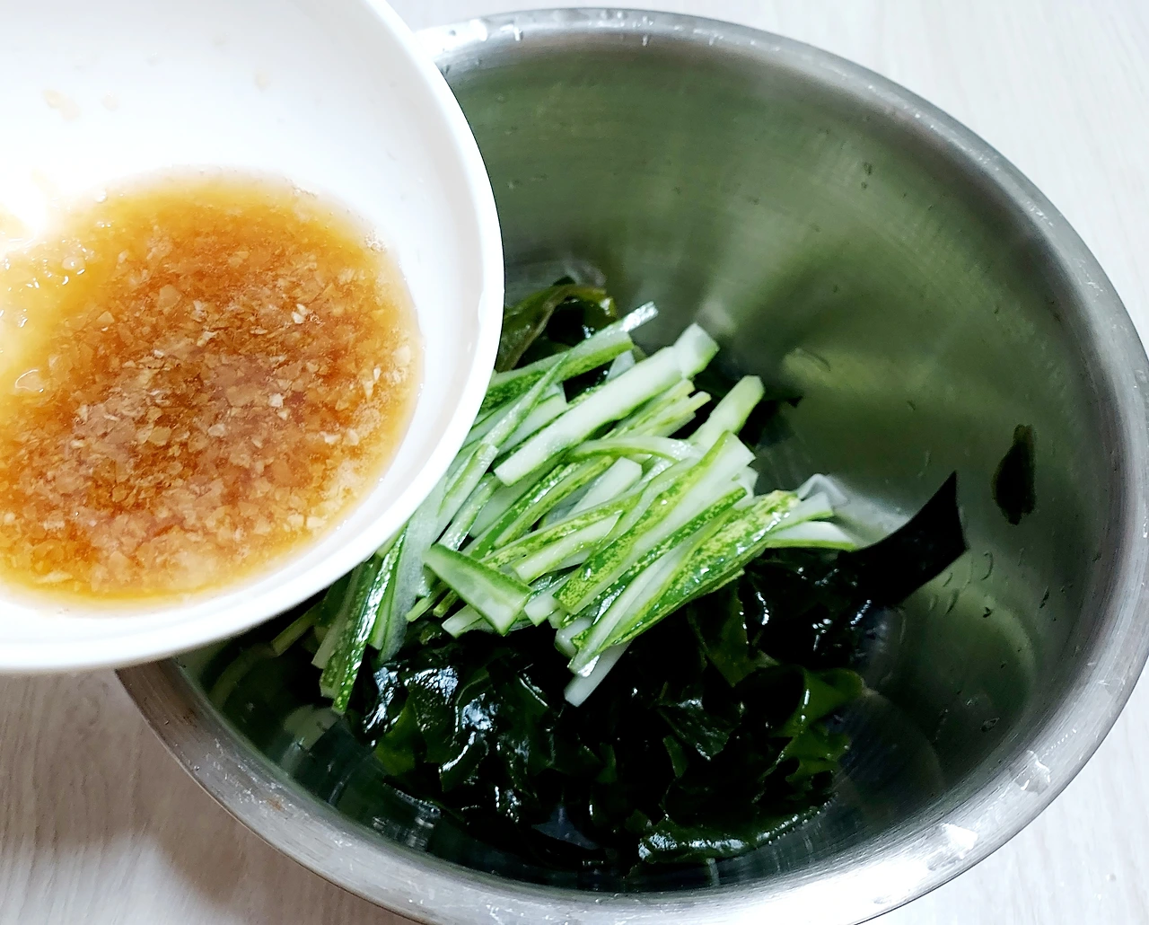 난 미역초무침을 할 때 미역과 오이에 양념장을 반 정도 넣고 먼저 무친 다음에 나머지 채소를 넣는다. 재료를 한꺼번에 무쳐 놓으면 미역과 오이가 겉도는 느낌이 들어 양념장 맛이 스며들게 3~4분 정도 시간차를 두고 있다.