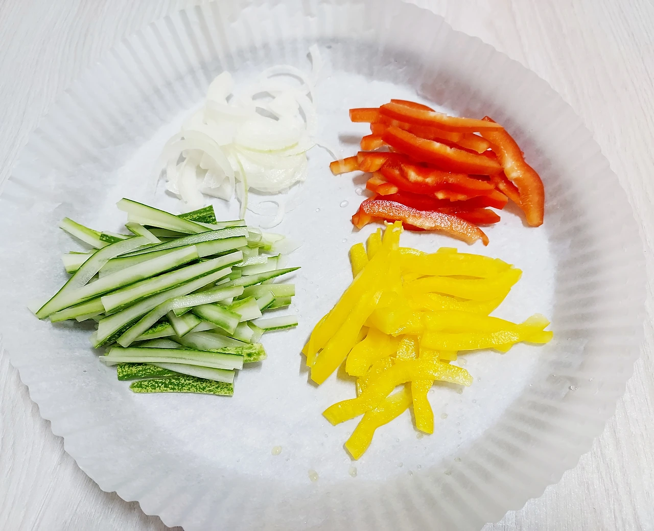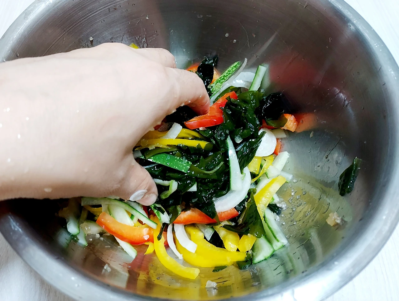 오이와 미역에 맛이 들면 나머지 채소와 양념장 넣고 살살 무치기. 부족한 간은 소금으로 해준다.