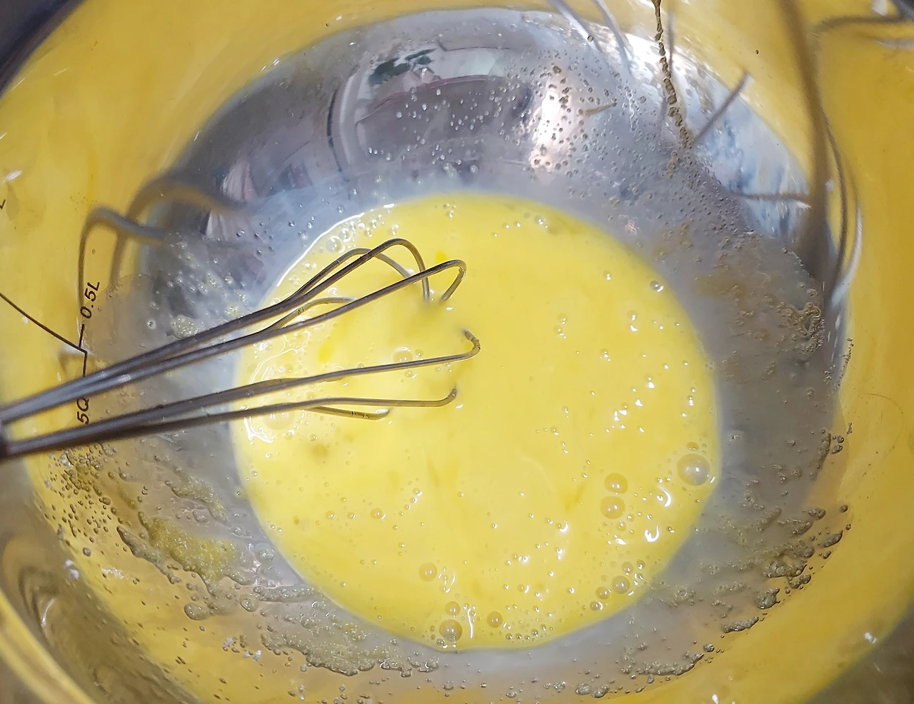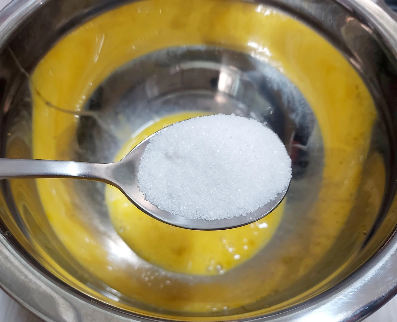 큼지막한 땅콩잼쿠키 8개를 만들어 볼 건데, 우선 실온에서 찬기운을 뺀 달걀 한 개에 설탕 평평하게 한수저를 넣어 거품기로 가볍게 저어준다.