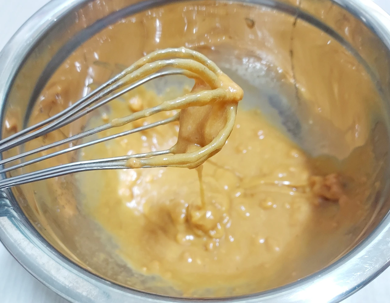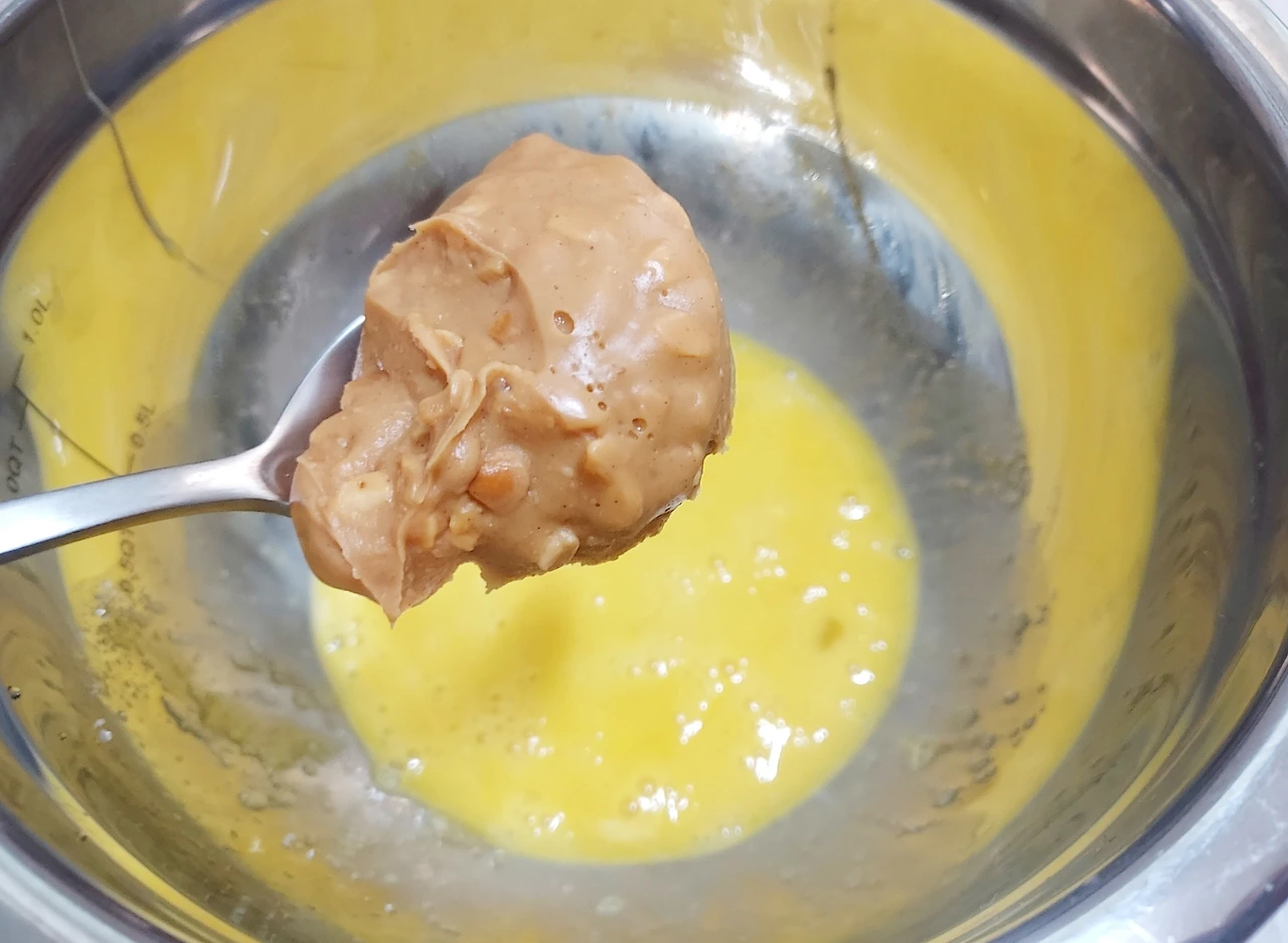 여기에 땅콩잼 수북하게 두 수저 넣어 죽처럼 풀어지도록 섞어준다. 땅콩잼은 크림처럼 부드러운 타입과 알갱이가 씹히는 타입의 제품이 있을 것이다. 난 씹는 맛이 있는 '알갱이 타입'을 좋아해 사용하고 있다.