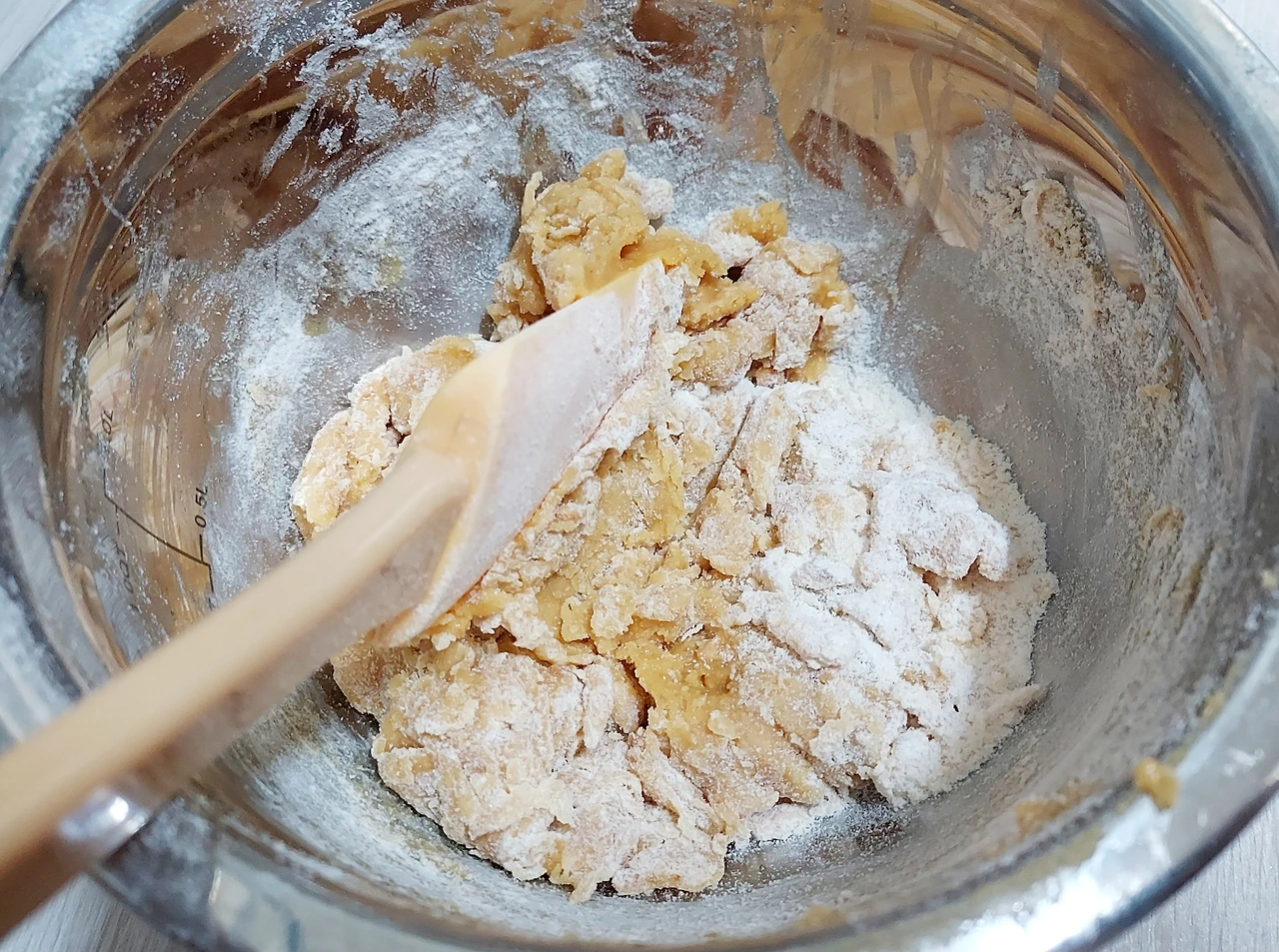 주걱으로 '11자'를 그리듯 섞어준다. 오래 섞지 말고 흰 가루가 없어질 정도면 된다. 이때 반죽이 너무 되직하면 우유 또는 물, 질면 가루믹스를 조금씩 넣어
