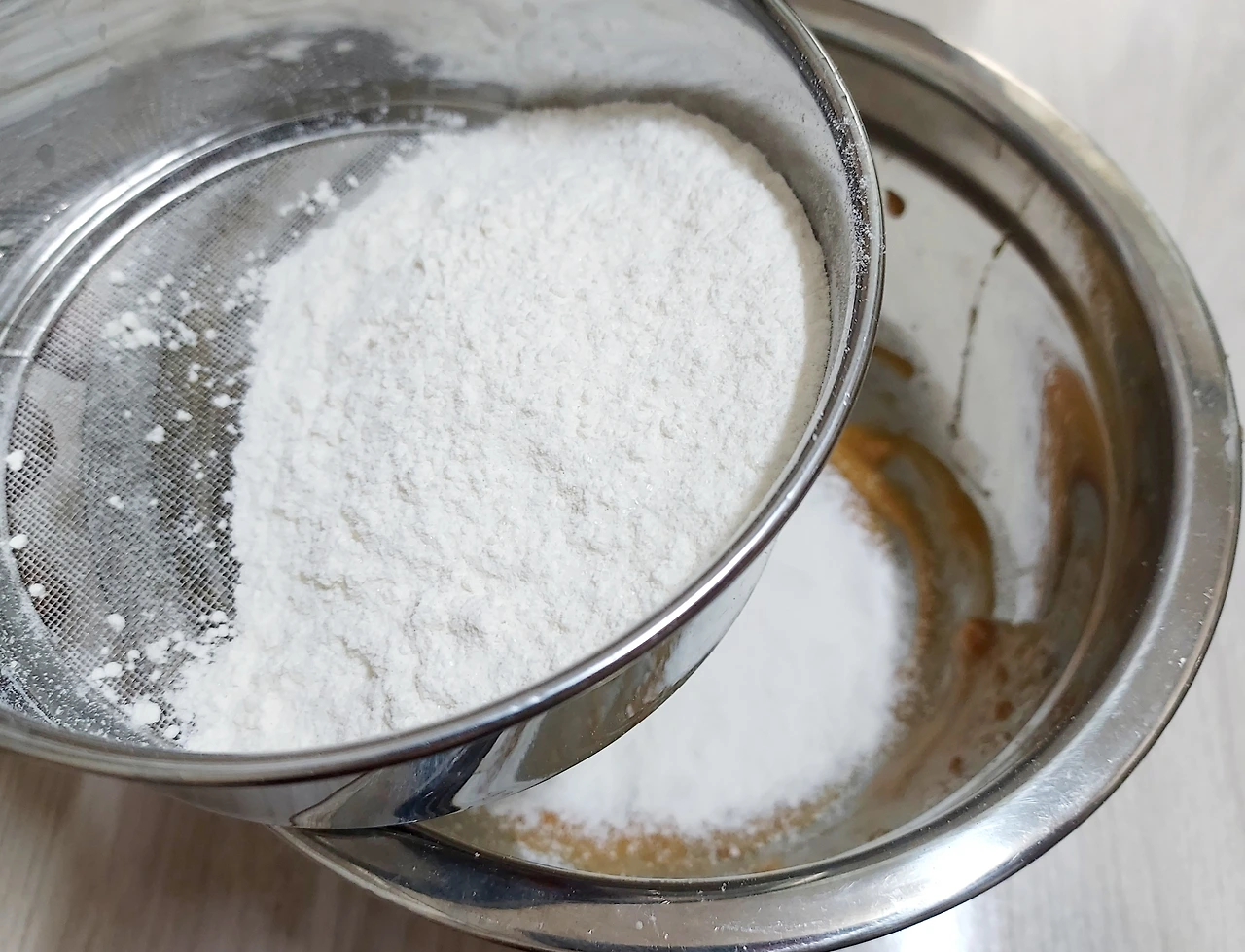 다음은 종이컵 한 개 반 정도 되는 팬케익믹스를 체에